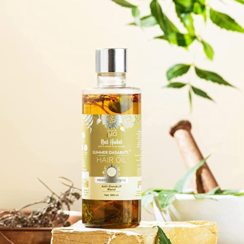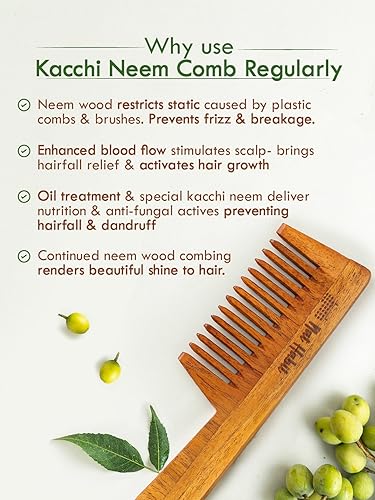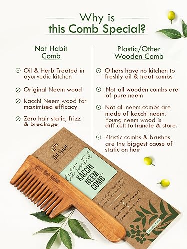 HANDMADE 100% NATURAL Wide Tooth KACCHI NEEM COMB For DETANGLING. Well suited for long or thick hair. Young neem wood combs provide multi-faceted benefits for hair & overall health. Drives hair growth & thickness. Controls hair & thinning Keeps away brittleness cuticle damage & hair breakage Controls dandruff & itchy scalp. Nat Habit Everyday Neem Bhringraj Anti Dandruff Summer Dasabuti Hair Oil for dandruff control. Specially made with cooling ingredients for Summer conditions. Inspired by Grandma’s secrets hair 100% Natural Ayurveda certified. This Dasabuti oil is enriched for over 10HRS via Slow Heat Infusion of fresh neem bhringraj curry leaves amla bel leaves brahmi shikakai methi tulsi triphala nagarmotha peppermint jaborandi & more in multiple oils such as castor coconut neem & mustard. 16 Ayurvedic herbs infused for maximised results. All oils are PURE Pressed. ZERO Paraffin &Mineral Oils. Zero chemic& .