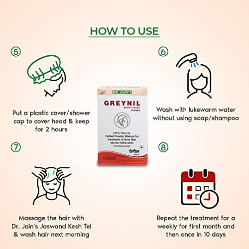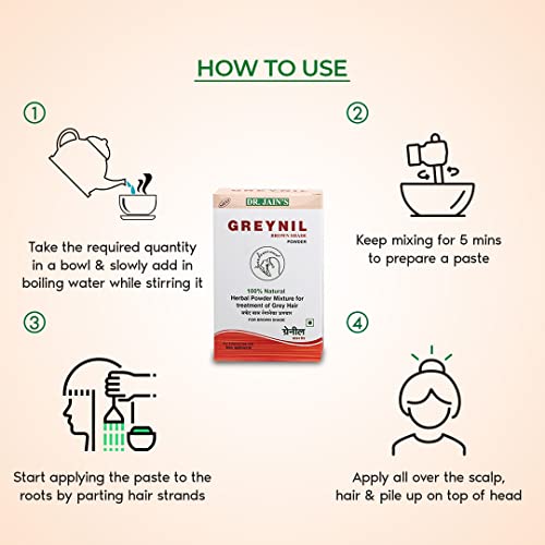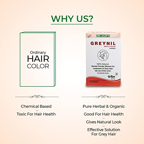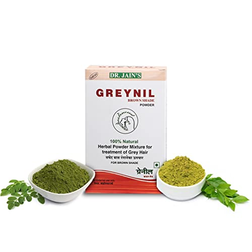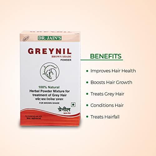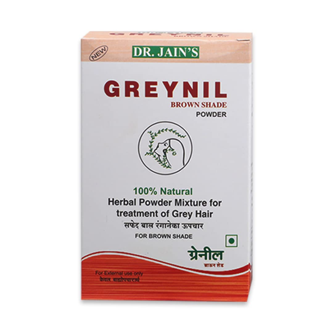 Dr. Jain's Herbal Products is one of the well-recognized manufacturers of Herbal Health Skin & Hair Care Ayurvedic Powders Gels & Aromatic Essential Oils. As per the demands a well-researched formulation based on pure herbal and Ayurvedic products. GREYNIL(Brown Shade) is a 100 % Natural Hair Color used to color grey hair without chemicals leaving a lustrous shine. It improves hair health by conditioning the roots and also boosts hair growth. HOW TO USE & BENEFITS :- "Take the required quantity in a bowl & slowly add it into boiling water while stirring it. Keep stirring for 5 mins and prepare a paste. Start applying the paste to the roots by parting hair strands. Apply all over the scalp hair and pile up on top of the head. Put a plastic cover/shower cap to cover the head. Keep it for 2 hours and wash with lukewarm water without using soap/shampoo. The colour will start appearing after 24 hours. Next day massage the hair with Dr. Jain's Jaswand Kesh Tel and wash the hair the next morning. Repeat the treatment for a week for the first month and then once in 10 days. BENEFITS FOR HAIR - Improves Hair Health Treats Grey Hair Adds Shine & Luster To Hair Cleanses & Detoxifies Scalp Conditions Hair Treats Hairfall Boosts Hair Growth Treats Split-Ends & Dandruff DESCRIPTION - Dr. Jain's Herbal Products is one of the well-recognized manufacturers of Herbal Health Skin & Hair Care Ayurvedic Powders Gels & Aromatic Essential Oils. As per the demands a well-researched formulation based on pure herbal and Ayurvedic products. GREYNIL(Brown Shade) is a 100 % Natural Hair Color used to color grey hair without chemicals leaving a lustrous shine. It improves hair health by conditioning the roots and also boosts hair growth."