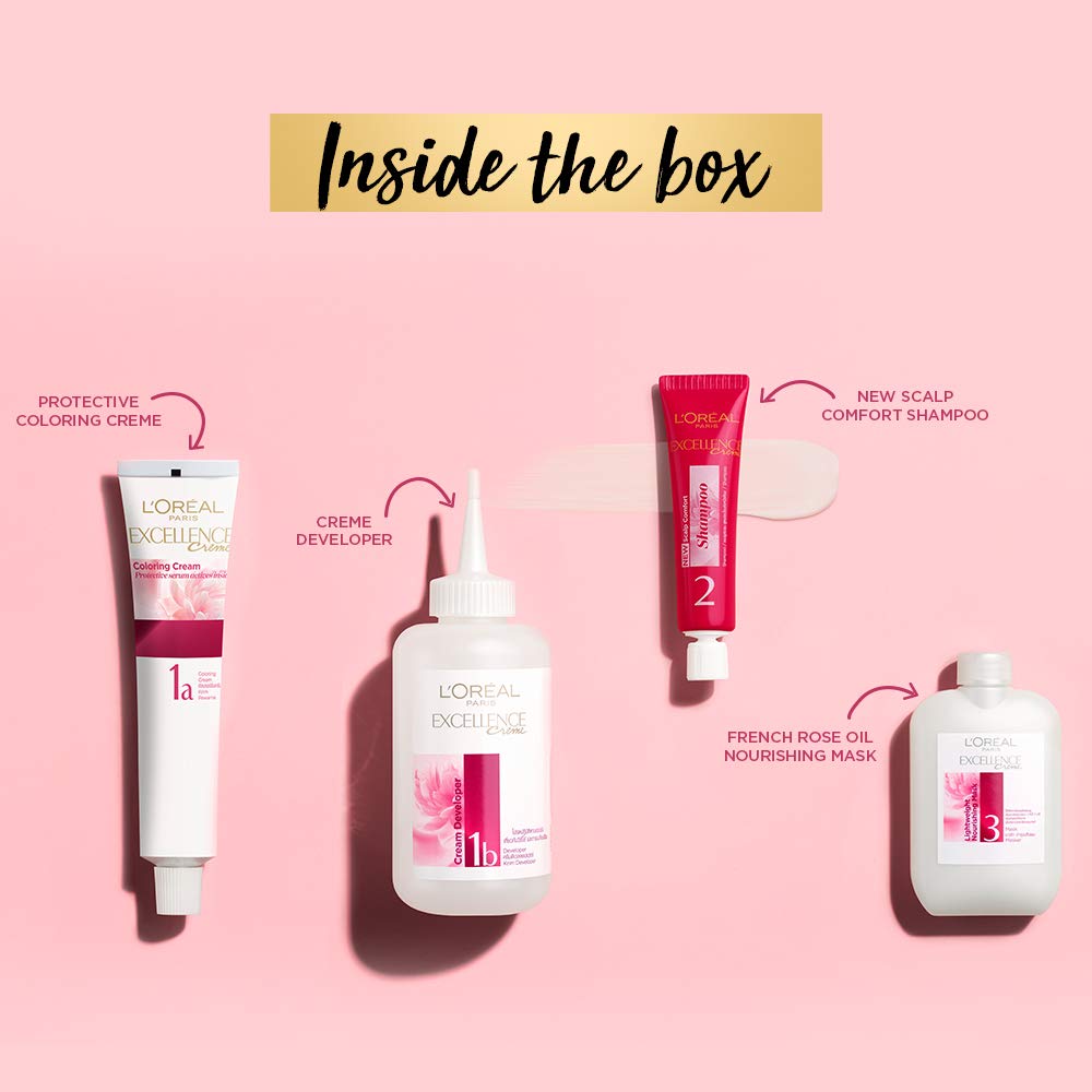 Product DescriptionLOreal Paris Excellence Creme gives the richest care for the richest colour. Over the last 20 years Excellence Creme has been part of womens life and consistently reinvented its formula as an expert; always more efficient with more care. Infused with its triple care formula: an advanced technology concentrating on 3 powerful ingredients strengthen your hair while colouring leaving it softer and protected and giving you 100% grey coverage from root to tip!From the Manufacturer THE EXCELLENCE CREME RANGE: RICHEST CARE FOR RICHEST COLOUR LOreal Paris Excellence Creme gives the richest care for the richest colour. Over the last 20 years Excellence Creme has been part of womens life and consistently reinvented its formula as an expert; always more efficient with more care. Infused with its triple care formula: an advanced technology concentrating on 3 powerful ingredients strengthen your hair while colouring leaving it softer and protected and giving you 100% grey coverage from root to tip! THE SECRET OF THE FORMULATION OF EXCELLENCE CRoME PRO-KERATIN STRENGTHENS CERAMIDE PROTECTS COLLAGEN REPLENISHES AN EXTENSIVE RANGE OF SHADES CLASSIC BLACK NATURAL BROWNS STYLISH BURGUNDY SPECIAL BROWNS RECREATE THE MAGIC WITH THE LIMITED EDITION EXCELLENCE LEGENDS COLLECTION As times change so do trends but some styles are eternal and some hair colours legendary. Just like Nargis and Madhubala. Two iconic beauties whove inspired L'Oreal Paris to recreate their timeless magic in shades just as timeless with the Excellence Legends Collection. Reliving their legacy is none other than Aishwarya Rai. Styled in Natural Darkest brown Shade 3 and Burgundy Shade 3.16 she personifies the art of elegance. With shades that beautifully complement Indian skin tones these hair colours are the classic transformation your hair deserves. BEAUTY ADVICE FROM OUR EXPERTS: CHRISTOPHE ROBIN LOREAL PARIS EXPERT COLOURISTI recommend Excellence to women who want ultimate grey coverage and intense care for their hair. I love Excellences colours for their richness of tones and their radiance. They are always very flattering to womens skin tones. His application tips for best results: Always use the Protective serum which conditions lengths and dry ends intensely nourishes and allows an even result without a block-colour effect. If you are deciding between 2 shades of Excellence Creme choose the lighter. Always consider that results will vary depending on your natural colour. SAFETY AND CARE ADVICE FROM LOREAL PARIS You must always do a skin allergy test without fail 48 hours before each use of this product. Do not use if you have previously experienced a reaction to a hair colourant or have an irritated or damaged scalp. If you have ever had even once a black henna tattoo you may have become allergic without knowing. You must do a skin allergy test 48 hours before use. Always follow the instructions leaflet. BEAUTY TIPS FOR FABULOUS HAIR COLOUR Use products specially formulated for coloured hair LOreal Paris Colour Protect is a complete range of products (shampoo and conditioner) specially developed to prolong the shine of your colour after washing. Excellence Creme is also ideal for covering highlights. It is advisable to put a little moisturizer cream on the skin and hair line to easily wipe away any splashes.