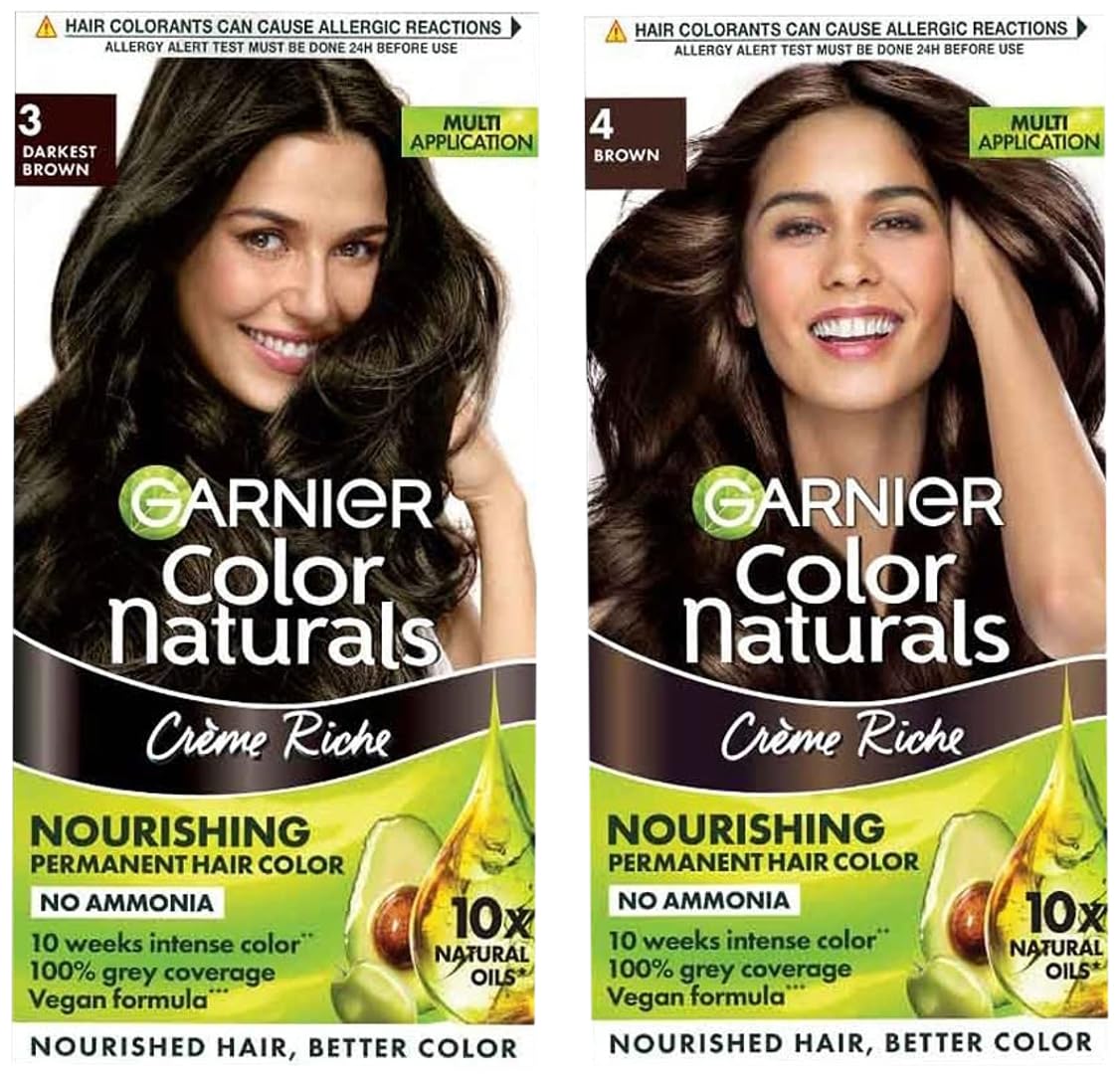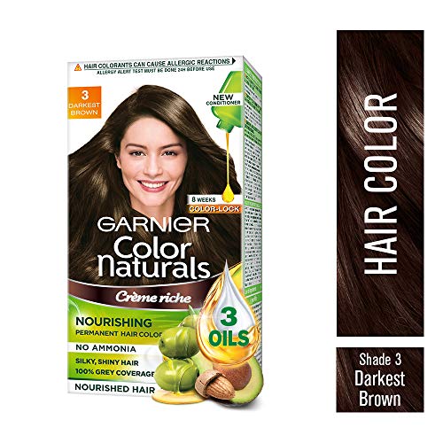 Garnier Color Naturals Cr¨me hair color Shade 3 Darkest Brown 70ml, + 60gGarnier Color Naturals is cr¨me hair colour which gives 100% Grey Coverage and beautiful rich color. It is an ammonia free hair color and has a superior Colour Lock technology which gives you rich long lasting color that lasts upto 8 weeks. Color Naturals comes in a range of 8 gorgeous shades especially suited for Indian skin tones. It is available in an easy to use kit which can be used at your convenience in the comfort of your house! It is enriched with the goodness of 3 oils â Almond Olive and Avocado which nourishes hair and provides shiny long lasting colour. Your Hair will love the nourishment and you will love the colour! To use mix equal parts of the colorant and the developer in a plastic or a glass bowl and apply the mixture to your hair with a brush on dry unwashed hair. Leave on for 30 minutes and rinse with water. Apply post colour-care conditioner (provided in kit) to the hair and rinse to reveal shiny rich hair color. Post Colour Care: We recommend using a colour protect shampoo and conditioner for long lasting colour. Note: Always do a skin allergy test 24 hours before use.Garnier Color Naturals Cr¨me hair color Shade 4 Brown 70ml, + 60gGarnier Color Naturals is cr¨me hair colour which gives 100% Grey Coverage and beautiful rich color. It is an ammonia free hair color and has a superior Colour Lock technology which gives you rich long lasting color that lasts upto 8 weeks. Color Naturals comes in a range of 8 gorgeous shades especially suited for Indian skin tones. It is available in an easy to use kit which can be used at your convenience in the comfort of your house! It is enriched with the goodness of 3 oils â Almond Olive and Avocado which nourishes hair and provides shiny long lasting colour. Your Hair will love the nourishment and you will love the colour! To use mix equal parts of the colorant and the developer in a plastic or a glass bowl and apply the mixture to your hair with a brush on dry unwashed hair. Leave on for 30 minutes and rinse with water. Apply post colour-care conditioner (provided in kit) to the hair and rinse to reveal shiny rich hair color. Post Colour Care: We recommend using a colour protect shampoo and conditioner for long lasting colour. Note: Always do a skin allergy test 24 hours before use.