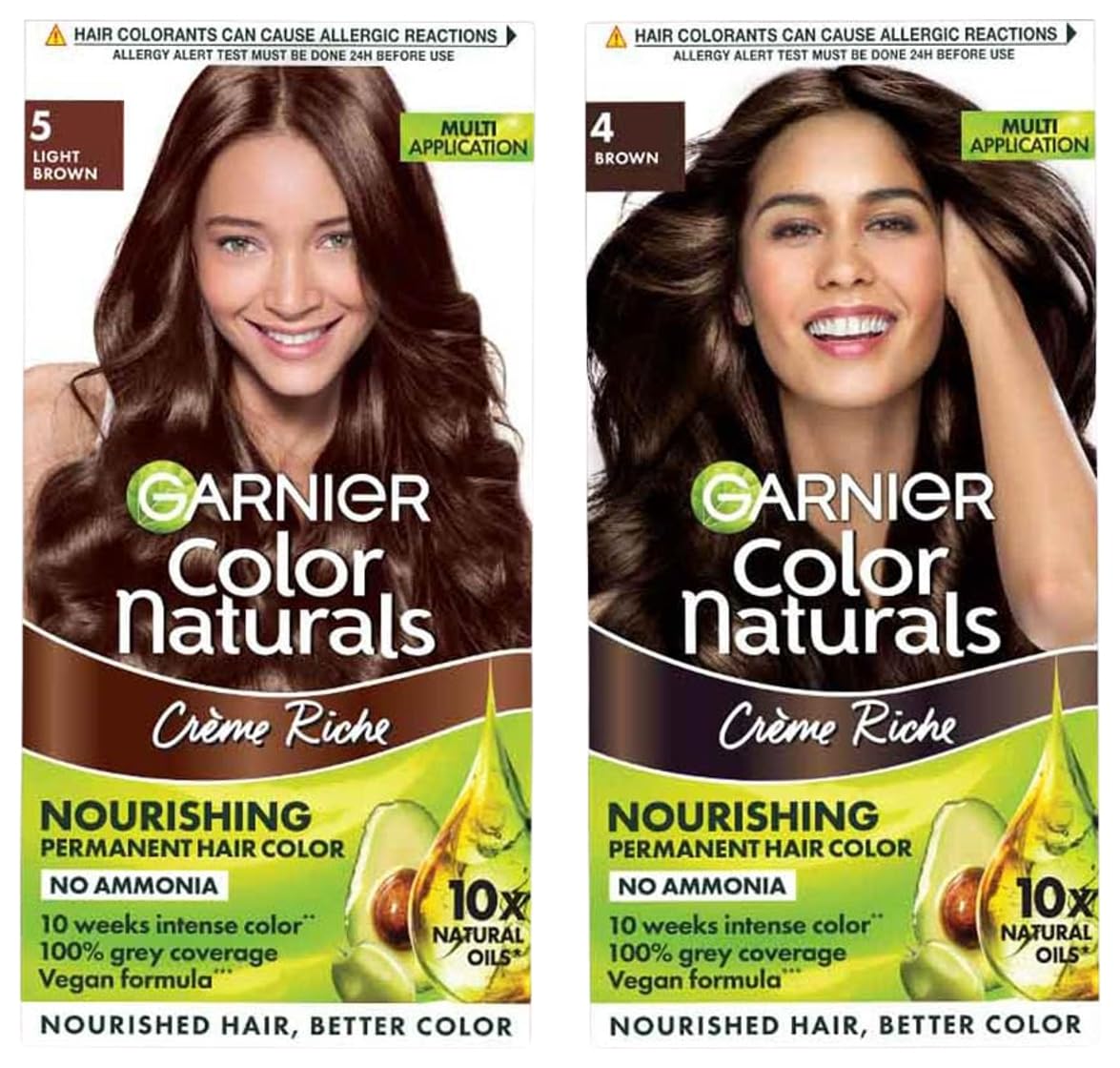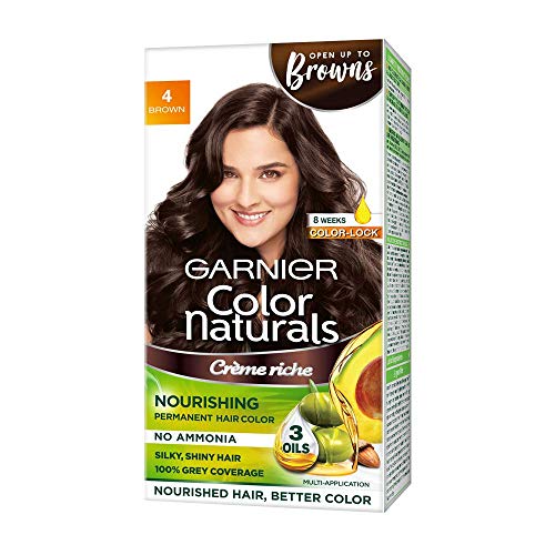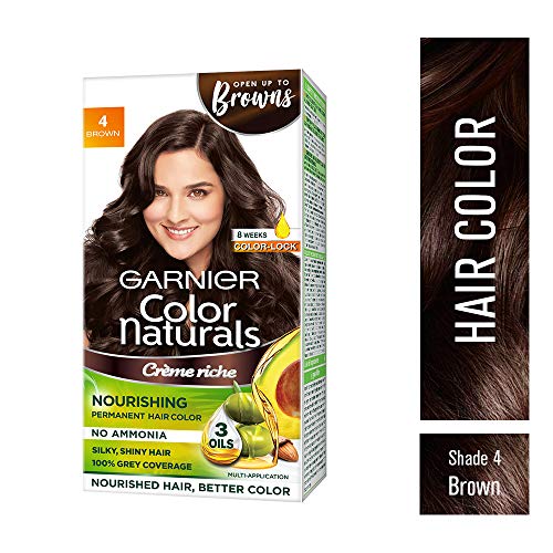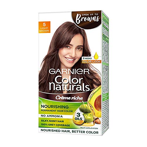 Garnier Color Naturals Cr¨me hair color Shade 4 Brown 70ml, + 60gGarnier Color Naturals is cr¨me hair colour which gives 100% Grey Coverage and beautiful rich color. It is an ammonia free hair color and has a superior Colour Lock technology which gives you rich long lasting color that lasts upto 8 weeks. Color Naturals comes in a range of 8 gorgeous shades especially suited for Indian skin tones. It is available in an easy to use kit which can be used at your convenience in the comfort of your house! It is enriched with the goodness of 3 oils â Almond Olive and Avocado which nourishes hair and provides shiny long lasting colour. Your Hair will love the nourishment and you will love the colour! To use mix equal parts of the colorant and the developer in a plastic or a glass bowl and apply the mixture to your hair with a brush on dry unwashed hair. Leave on for 30 minutes and rinse with water. Apply post colour-care conditioner (provided in kit) to the hair and rinse to reveal shiny rich hair color. Post Colour Care: We recommend using a colour protect shampoo and conditioner for long lasting colour. Note: Always do a skin allergy test 24 hours before use.Garnier Color Naturals Cr¨me hair color Shade 5 Light Brown 70ml, + 60gGarnier Color Naturals is cr¨me hair colour which gives 100% Grey Coverage and beautiful rich color. It is an ammonia free hair color and has a superior Colour Lock technology which gives you rich long lasting color that lasts upto 8 weeks. Color Naturals comes in a range of 8 gorgeous shades especially suited for Indian skin tones. It is available in an easy to use kit which can be used at your convenience in the comfort of your house! It is enriched with the goodness of 3 oils â Almond Olive and Avocado which nourishes hair and provides shiny long lasting colour. Your Hair will love the nourishment and you will love the colour! To use mix equal parts of the colorant and the developer in a plastic or a glass bowl and apply the mixture to your hair with a brush on dry unwashed hair. Leave on for 30 minutes and rinse with water. Apply post colour-care conditioner (provided in kit) to the hair and rinse to reveal shiny rich hair color. Post Colour Care: We recommend using a colour protect shampoo and conditioner for long lasting colour. Note: Always do a skin allergy test 24 hours before use.