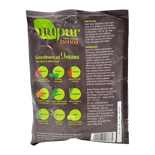 • Contains: 1 unit of Godrej Nupur 100% Pure Henna Mehandi for hair (150g); 100% PProvides rich shade and superior hair colouring