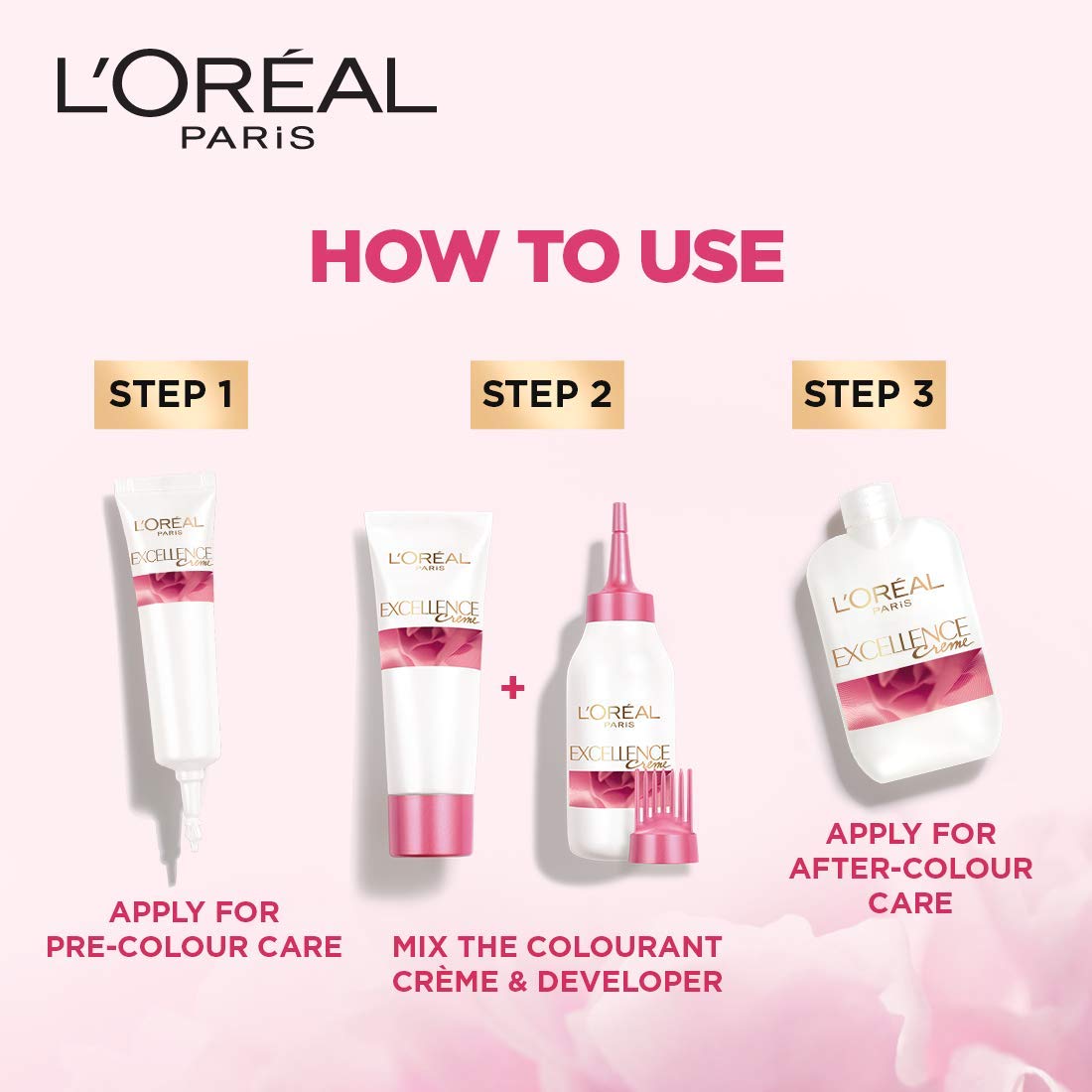 Buy this exciting combo pack. L'Oreal Paris excellence cr¨me hair colour is a triple care colour with triple care formula. 100 percent grey coverage from root to tips.