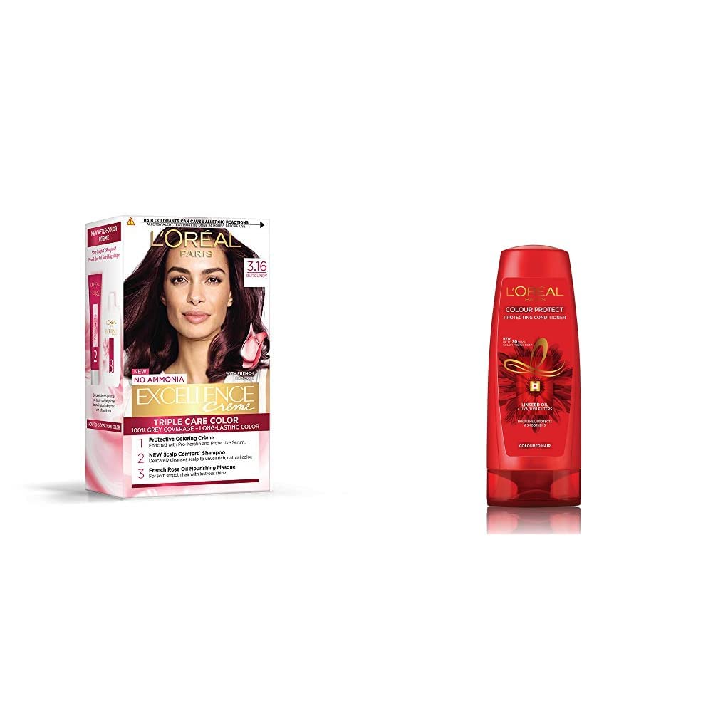 L'Oreal Paris Excellence Creme Hair Color 3.16 Burgundy 72ml+100gL'Oreal Paris Excellence Creme Hair Color is a triple care colour with triple care formula. 100 percent grey coverage from root to tips. Stronger hair 85 percent more resistant to brushing. For a beautifully blended colour that complements your look without a grey in sight. Rich even long lasting hair colour with a soft and silky touch. Excellence Creme hair colour triple protection means three ways to care for your hair: ceramide protects pro-keratin strengthens & collagen replenishes. In this pack you will find: the protective serum colouring creme and developer and conditioner. Maximum Shelf Life: 36 MonthsL'Oreal Paris Color Protect Conditioner 192.5ml (175ml+17.5ml)Colour Protect conditioner nourishes the hair and transforms its surface keeping the hair protected and prolonging the color radiance. The Colour Protect formula with UV filter- Light Reflecting System combines an active nourishing ingredient and filters for color treated hair. Dry hair meet your match. LOreal Paris offers hair conditioners for every concern and hair type. Whether youre looking to moisturize dry hair want a conditioner for colored hair or want to help repair damaged hair with a deep conditioner we have the hair conditionerand complementary shampoothat best fits your needs!.