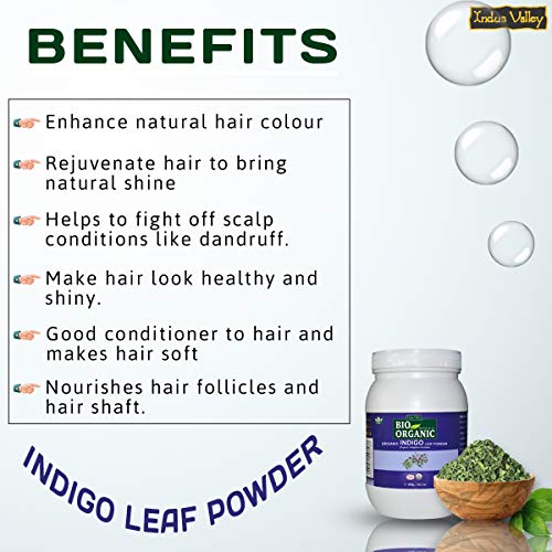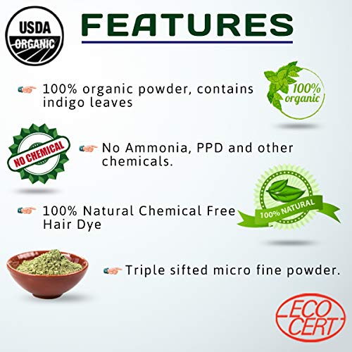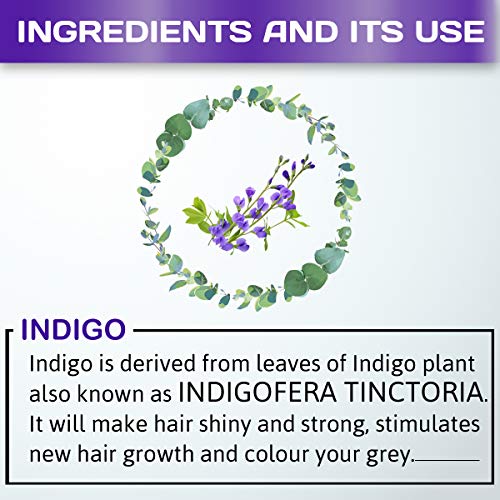 • This organic indigo powder for hair contains indigo leaves (indigofera tinctoria) which is instrumental to give dark blue colour.