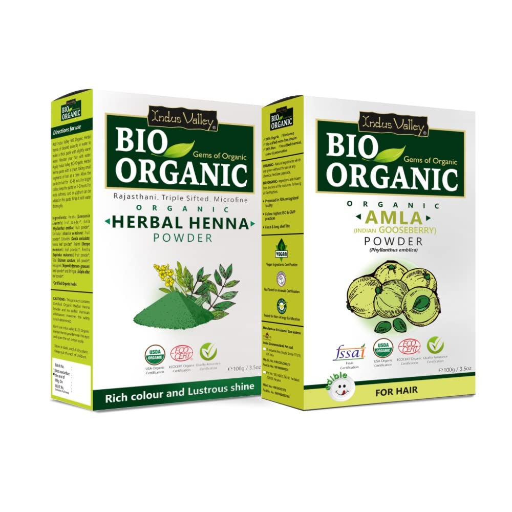 INDUS VALLEY Bio Organic Amla Powder is an organic solution to keep your hair healthy and shining throughout. It works as an excellent hair conditioner and due to its organic elements it can also be used as an effective cleanser for face. This pure amla hair powder brings to your hair the nourishment of the Indian gooseberry which has been used by many generations to obtain silky long hair. Amla powder helps in stimulating hair growth and preventing hair loss so now you can rest all your hair fall worries and enjoy long and strong hair. This amla powder is ideal for Men and Women. Both products are 100% Herbal and naturally homemade. Bio Organic Herbal Henna Powder is a Rajasthani 100% organic herbal henna powder that gives your hair the healthiest henna color ensuring gray coverage and health of your hair simultaneously. With the presence of natural herbs like Henna Amla Shikakaibrahmi reetha tulsi fenugreek bhringraj and colorless henna it boosts your hair's health protects it from hair related issues like dandruff itchy skin etc. Being dermatologist recommended it is absolutely safe for lactating or pregnant mothers and also safe for people allergic to hair colors.