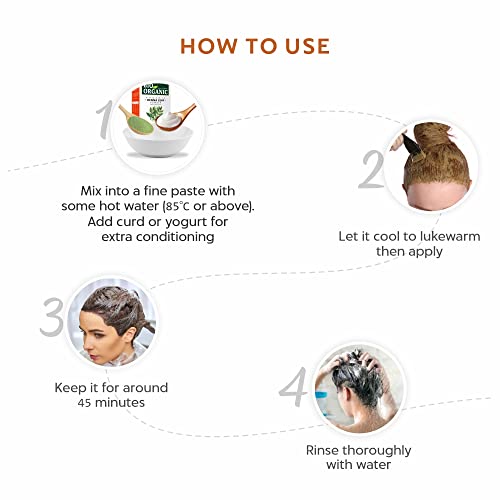 • 100 % certified and organic henna powder with and completely natural ingredients and no added chemicals whatsoever.