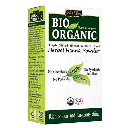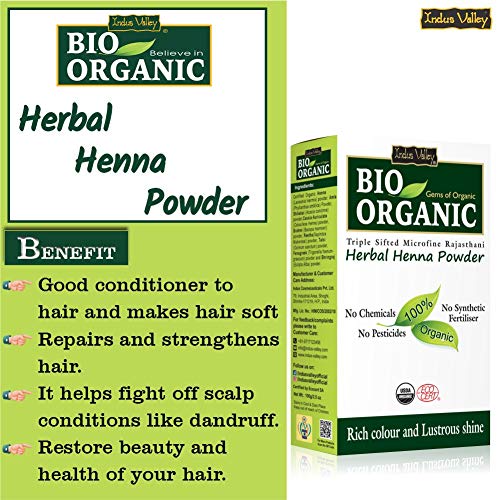 Indus Valley presents the combo of Bio-Organic Amla Fruit Powder with 2 packs of Bio-Organic Herbal Henna Powder. The triple-sifted microfine Amla powder and Henna powder are 100% pure and do not contain any synthetic chemicals pesticides fertilizers fragrances or additives. The addition of Amla Powder to the Herbal Henna Powder doubles up the coloring impact of Henna on hair. The combo darkens the hair colour naturally while also helping in reducing the increase in number of greys. Herbal Henna Powder comes with the goodness of 9 natural herbsâHenna Shikakai Tulsi Brahmi Bhringraj Fenugreek Colorless Henna Amla and Reetha. It deeply conditions your hair and hydrates dry hair while imparting colour. The natural antifungal and antimicrobial properties of henna soothe your scalp control scalp itchiness and flakiness. Amla Fruit powder nourishes and conditions your hair making it shiny and voluminous. Vitamin C in Amla powder herbal for hair enhances the process of hair buildup and strengthens them from their roots. Amla powder for eating purposes improves immunity and digestio.