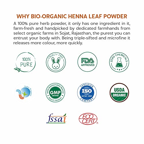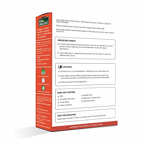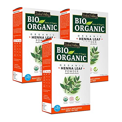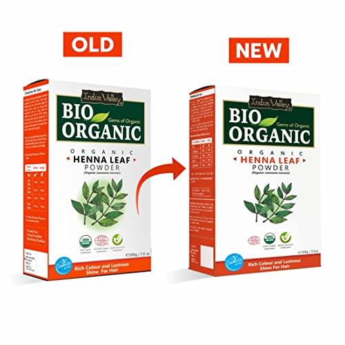 Indus Valley's Bio-Organic Henna Leaf Powder is 100% pure and organic. It doesn't contain any harmful chemicals or preservatives. It is made using the leaves of the Rajasthani Henna (Lawsoniainermis) plant. Henna leaves are shade dried and then grounded into a triple-sifted microfine powder which doesn't form lumps even after prolonged packaging. This superfine powder is very easy to use and non-messy. Henna Powder also helps in making hair healthy and strong. It is also effective in nourishing the scalp conditioning rough & dry hair and enhancing hair texture. This henna powder can be mixed with other natural hair dyes such as organic Indigo Chamomile or Manjishtha Root powder for achieving bright and exciting hair colors. Henna leaf powder leaves hair excitingly nourished ensuring grey coverage naturally. This is considered the safest way to color hair as henna is completely free from allergens and side effects. Being natural henna suits all skin & hair types.It's certified Organic India Ecocert USDA Organic Halal and alsodermatologist recommend it to lactating or pregnant mothers.