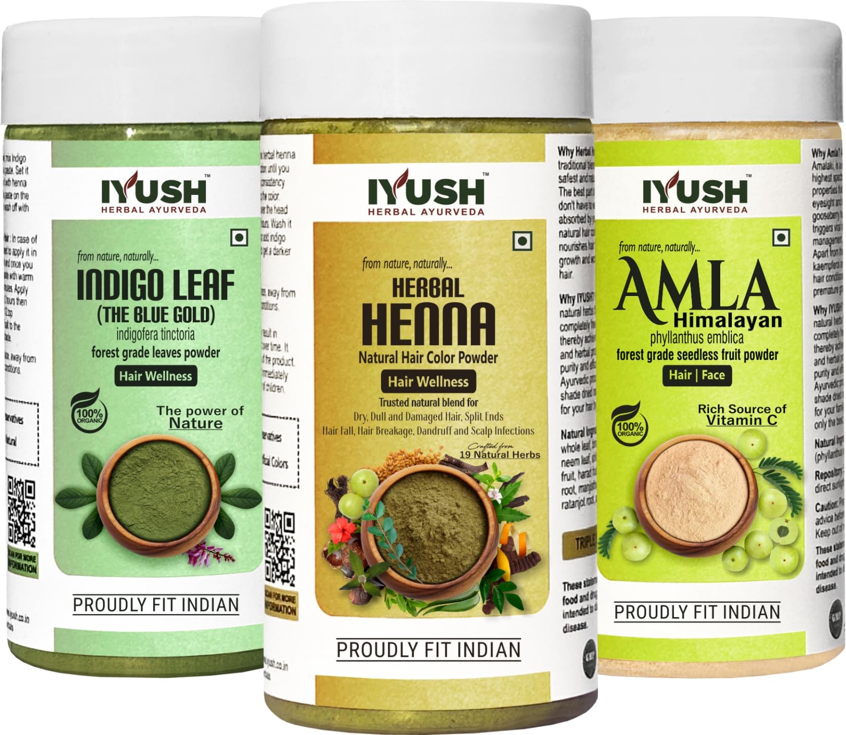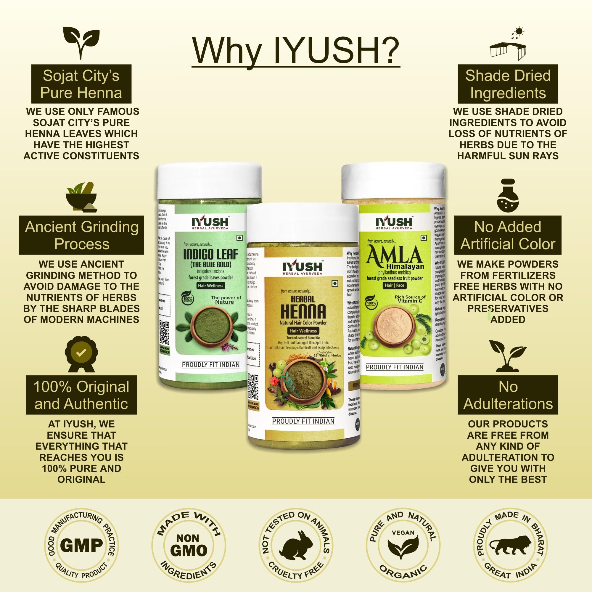 IYUSH Herbal Ayurveda Amla Powder with Indigo Powder for Hair and Herbal Henna Powder for Hair Colour 750gm | Natural Hair Colour | Hair Mask for Dry and Frizzy Hair | Hair Volume Powder |250gm each