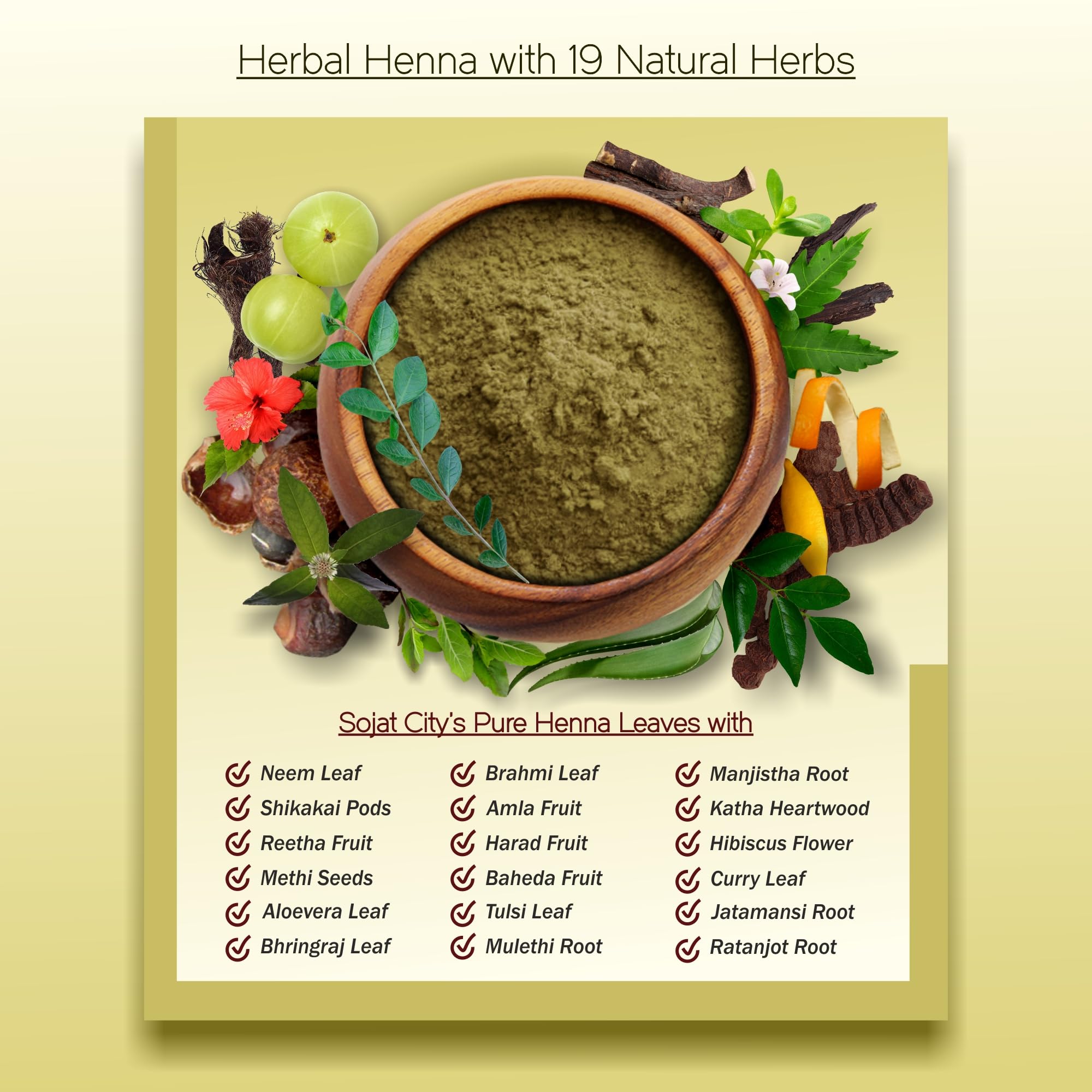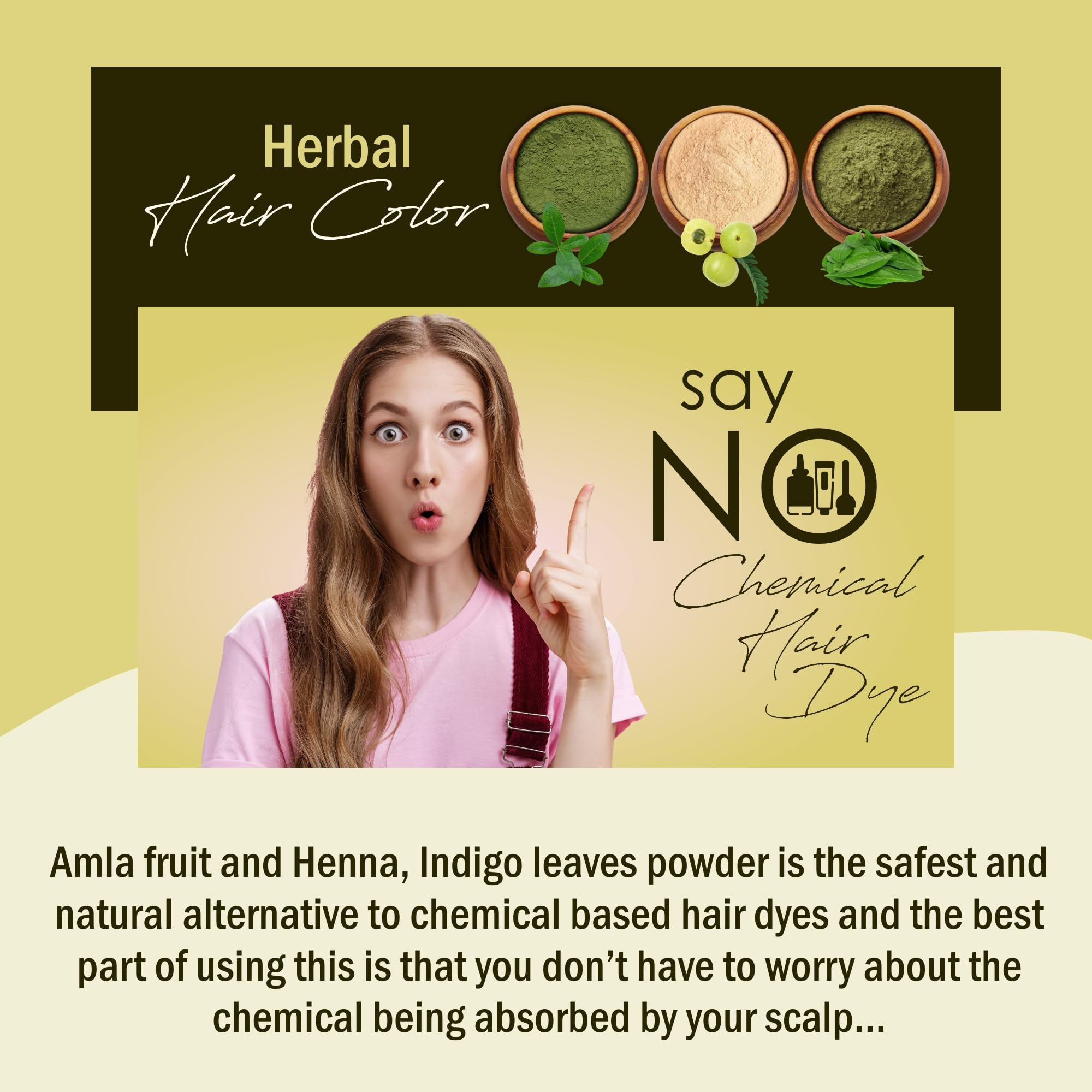 • Herbal Mehndi for Hair Nourishment: It is an ancient and traditional blend of 19 potent natural herbs like Amla Reetha Shikakai Bhringraj Hibiscus Brahmi Methi Tulsi Neem Aloevera Mulethi Triphala Manjistha Jatamansi Katha etc. mixed in unique proportions