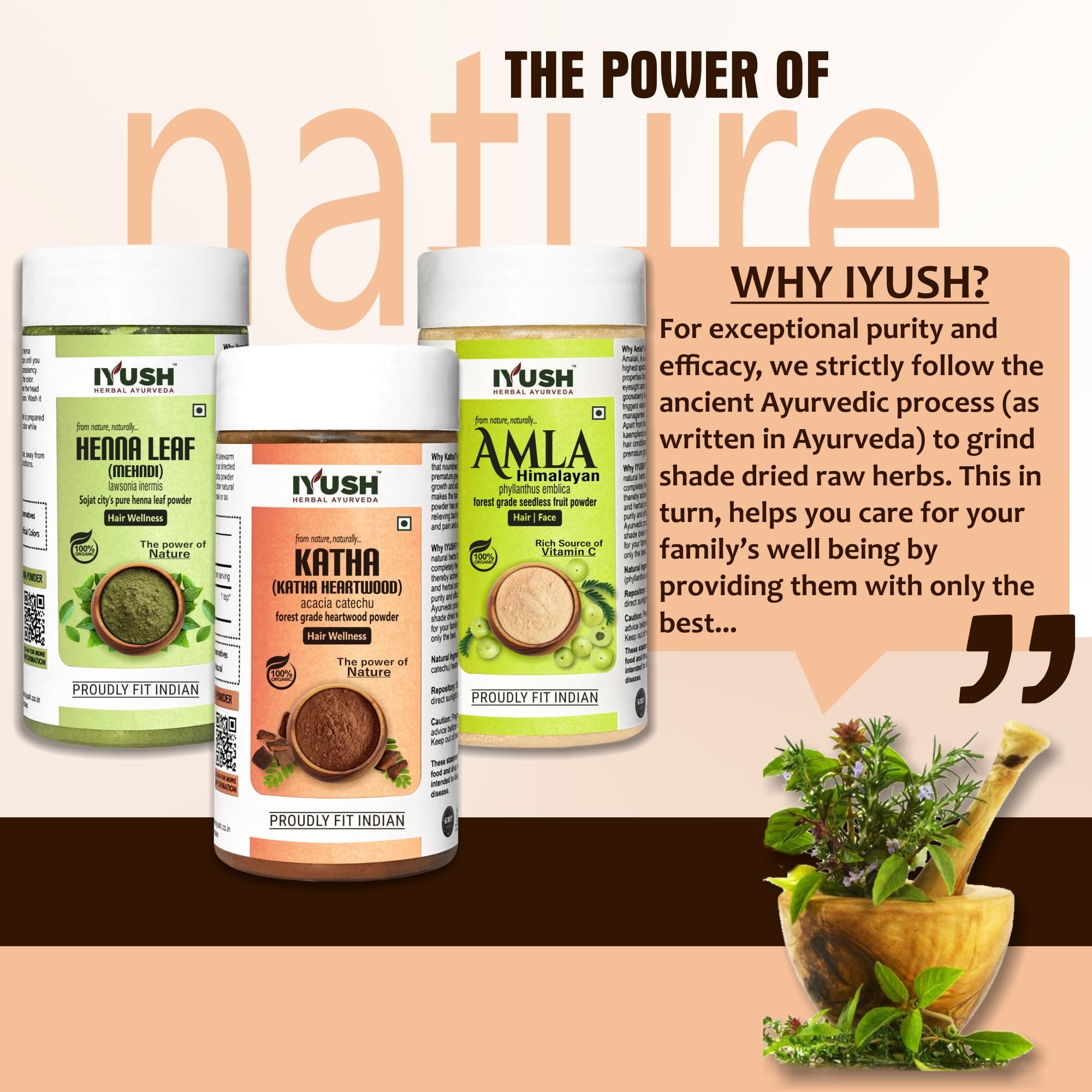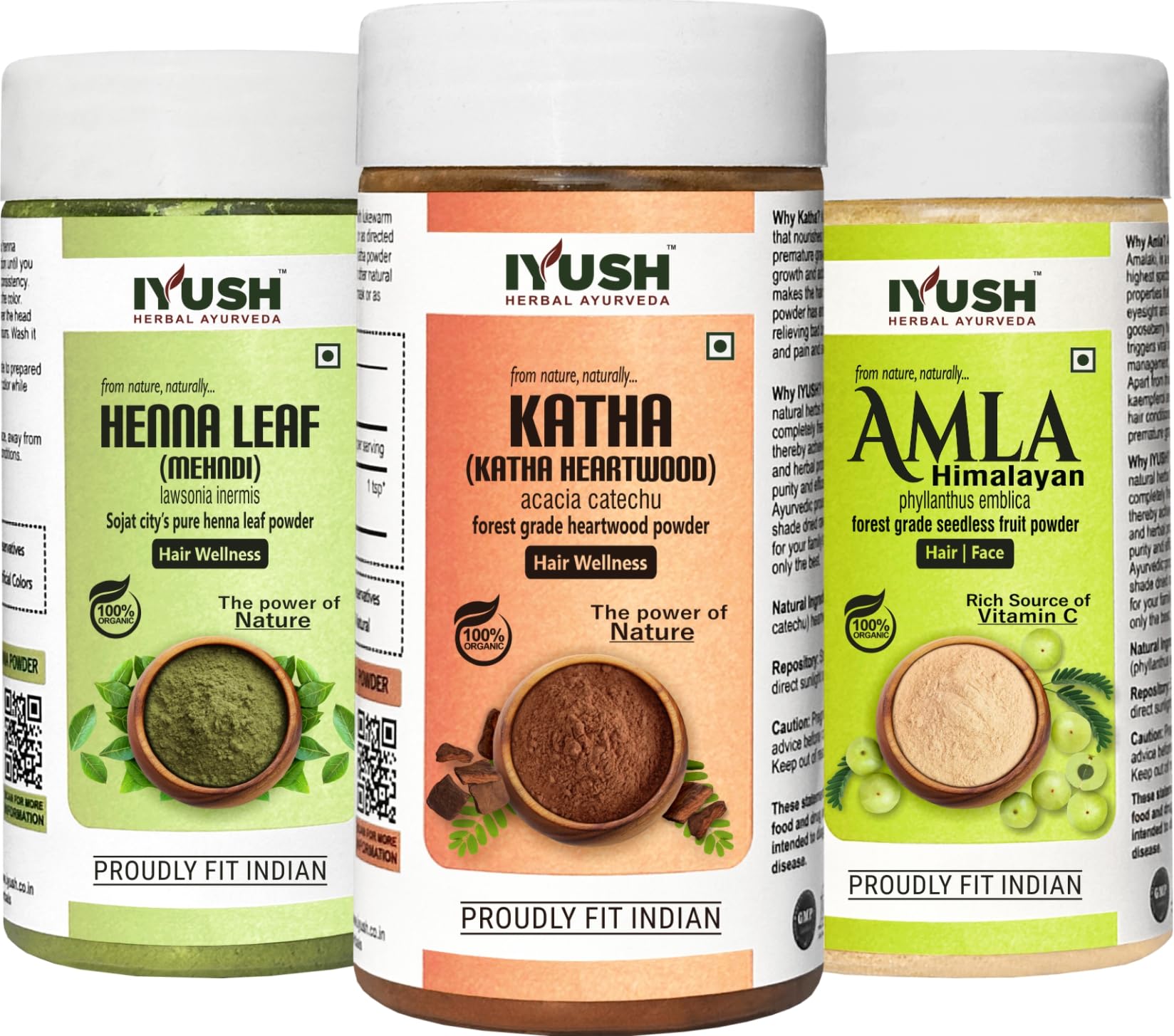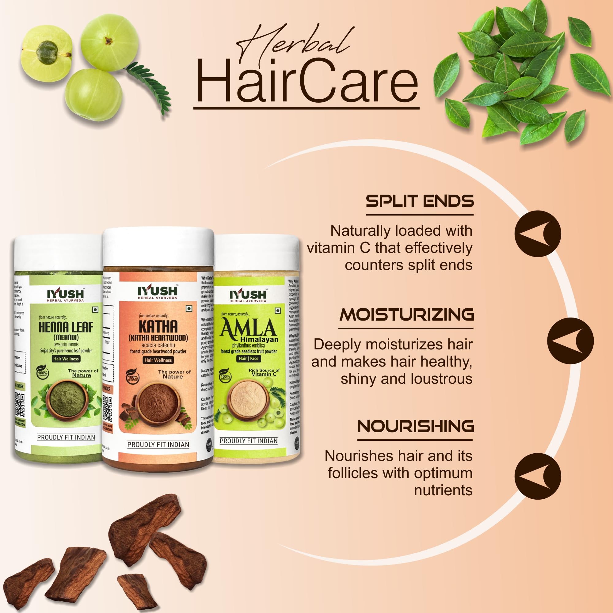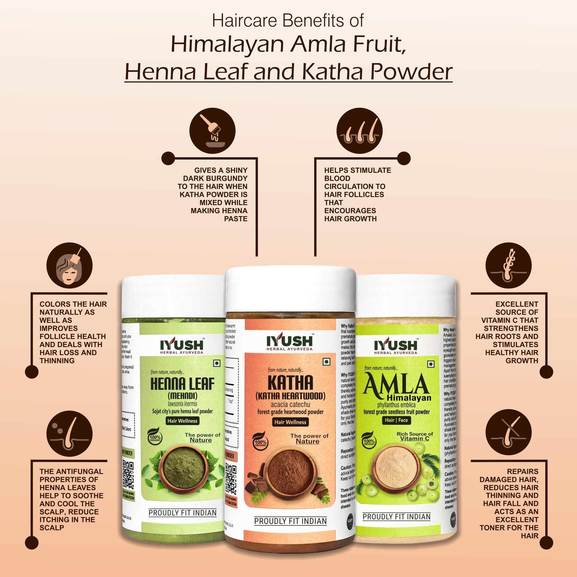 IYUSH Herbal Ayurveda Amla Powder with Katha Powder and Henna Powder for Hair Colour 300gm | Natural Hair Colour | Hair Mask for Dry and Frizzy Hair | Hair Volume Powder | Hair Powder | 100gm each