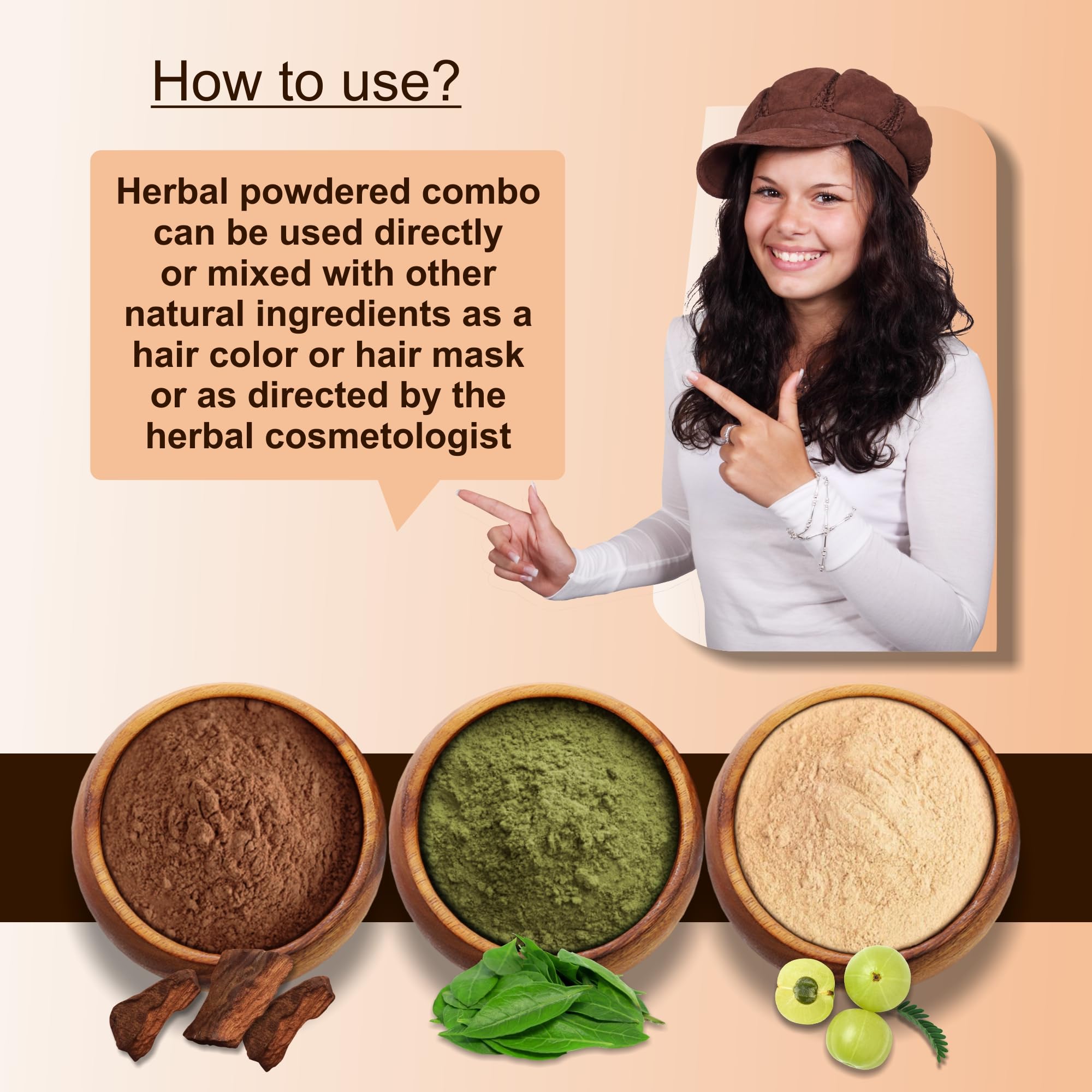 The Combo of Herbal powders is a combination of natural herbs that have been used since ages for a variety of hair care regimens. It is an organic natural combo made from shade-dried wild forest grade herbs that contain the highest active nutrients grown naturally without any harmful chemicals or pesticides or fertilizers.