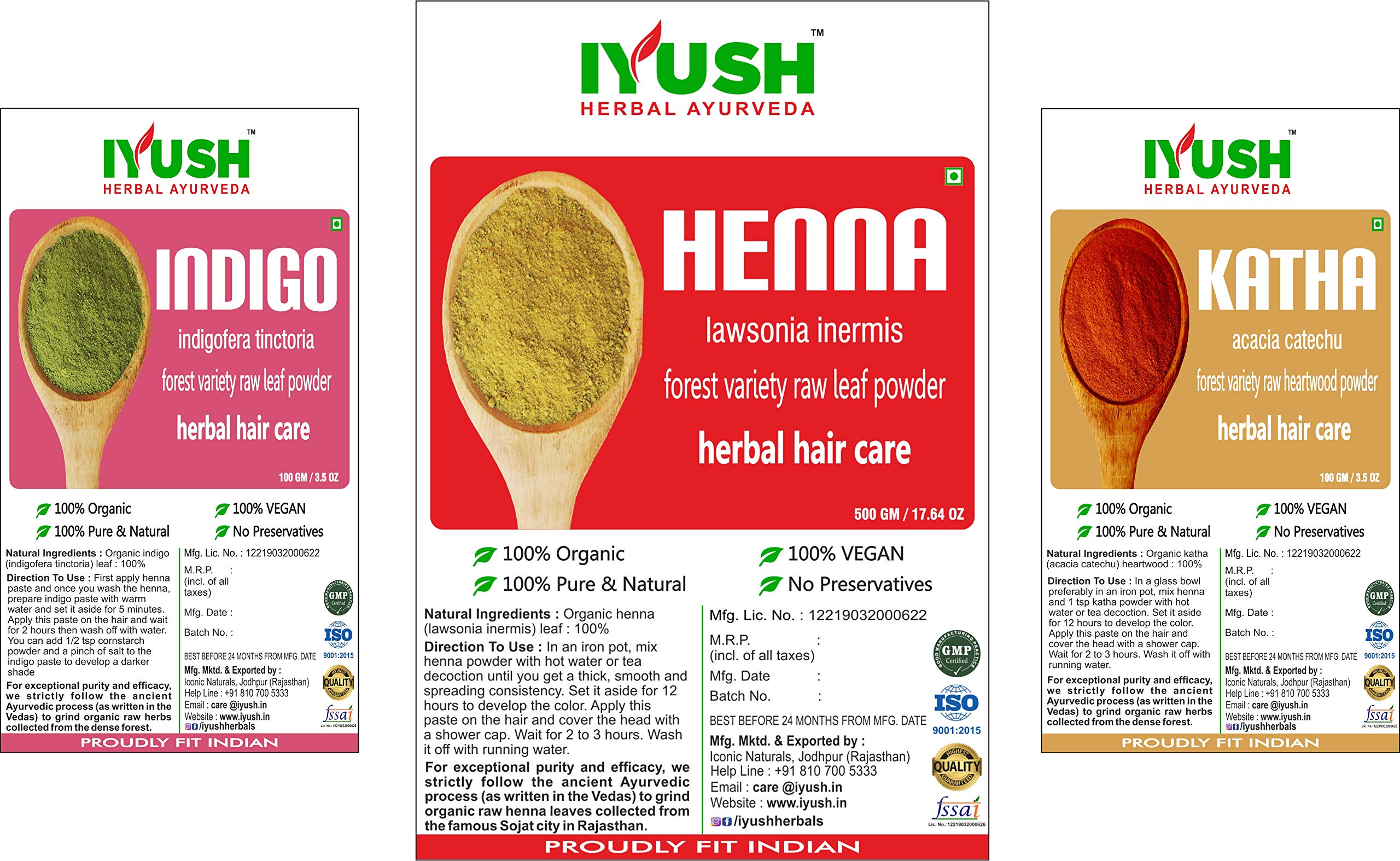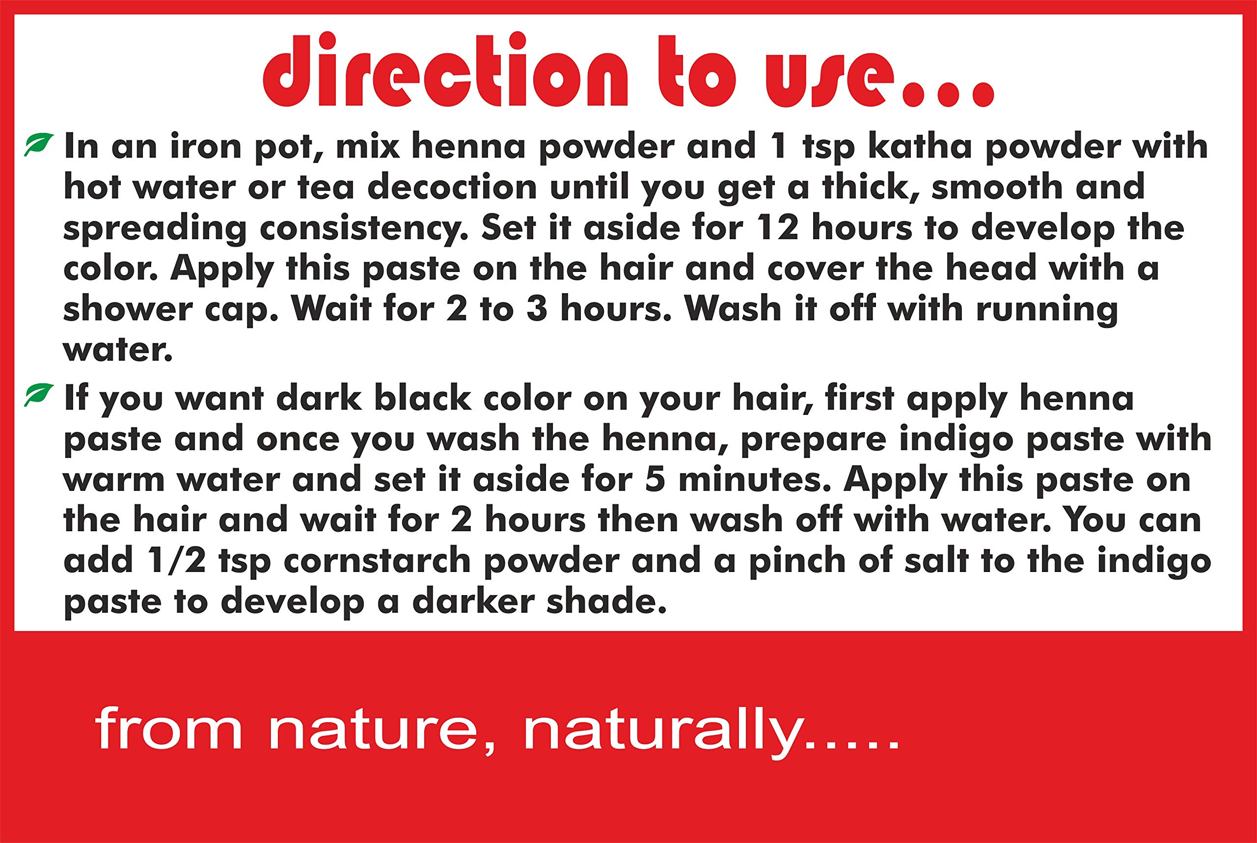 Henna a super leaf is the safest and natural alternative to chemical hair dyes. It nourishes the hair and its follicles improves hair growth and works wonders on dry and damaged hair. Katha rejuvenates hair to bring natural color as well as natural shine. It gives dark brown color when mixed with henna powder. Indigo powder nourishes the hair and its follicles and also gives hair a dark black color when applied after henna paste
