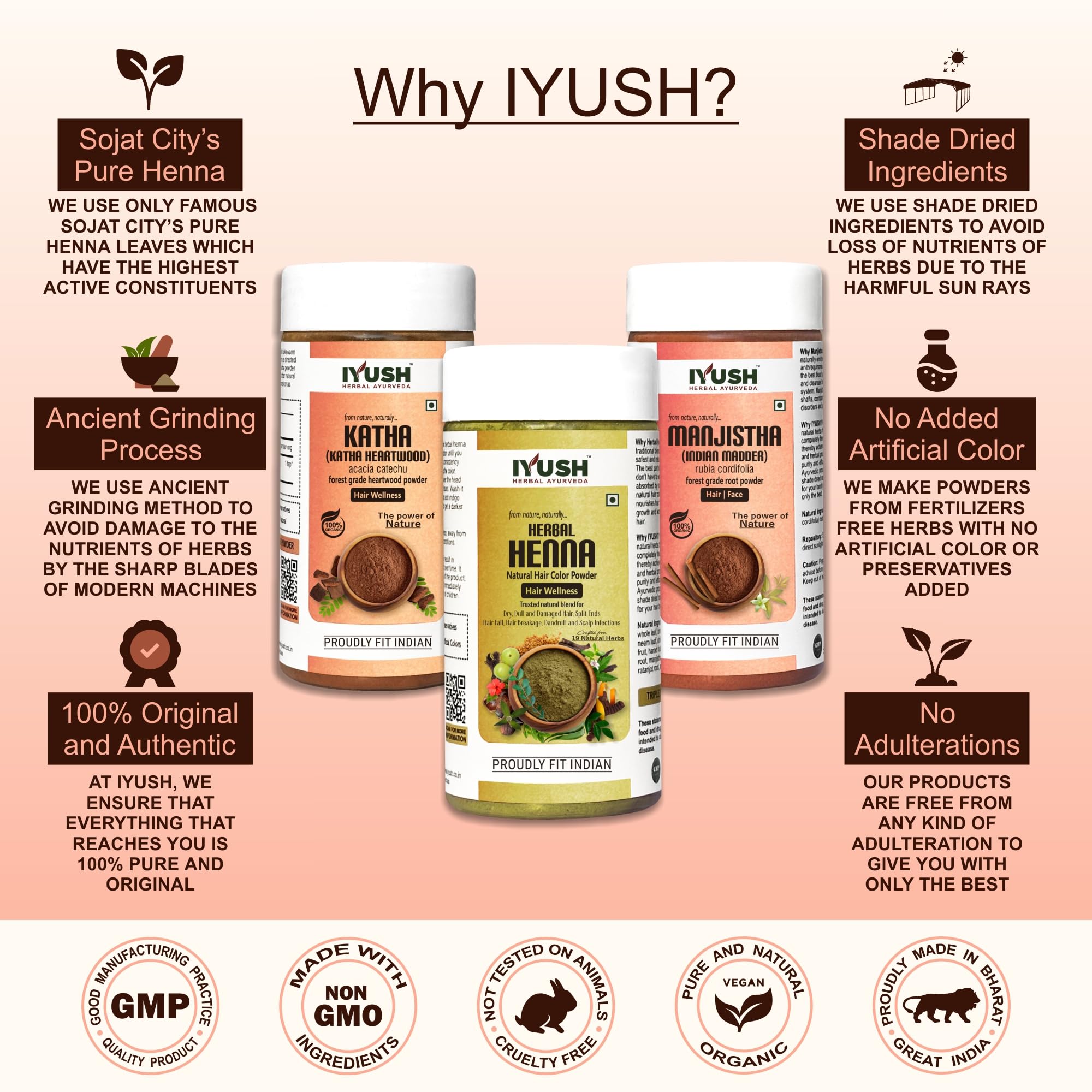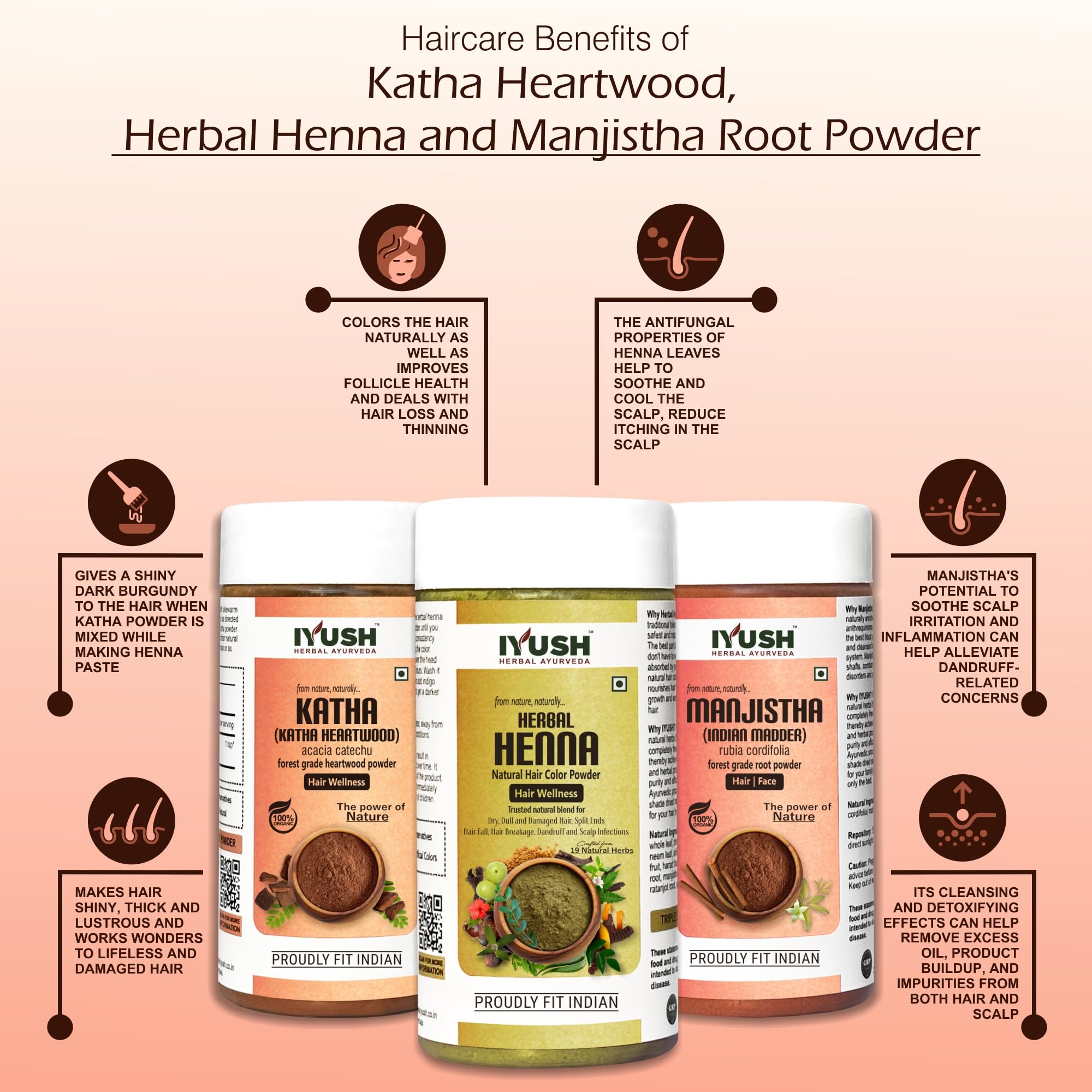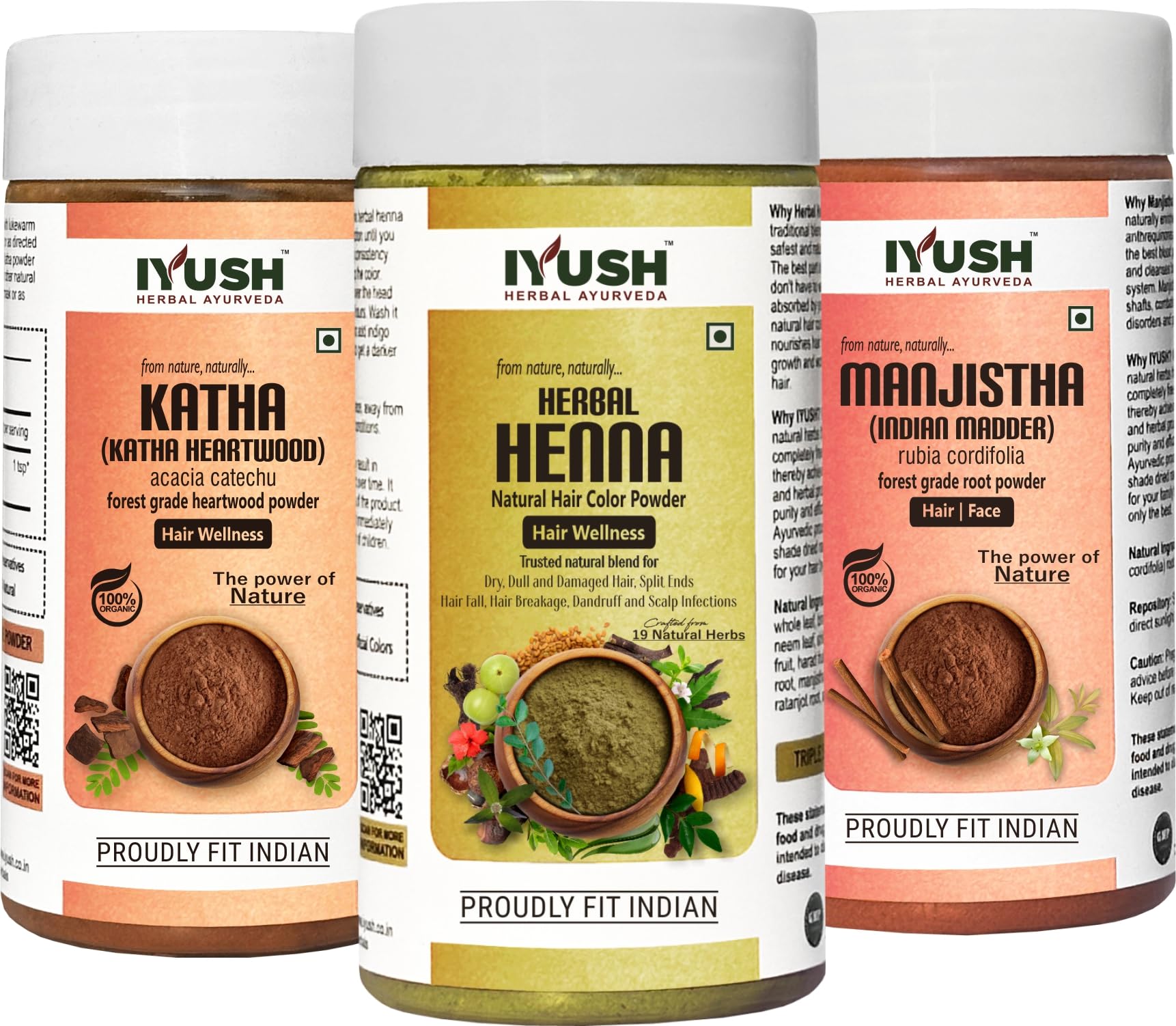 IYUSH Herbal Ayurveda Manjistha Powder with Katha Powder for Hair and Herbal Henna Powder for Hair Colour 300gm | Natural Hair Colour | Hair Volume Powder | Hair Mask for Hair Growth | 100gm each