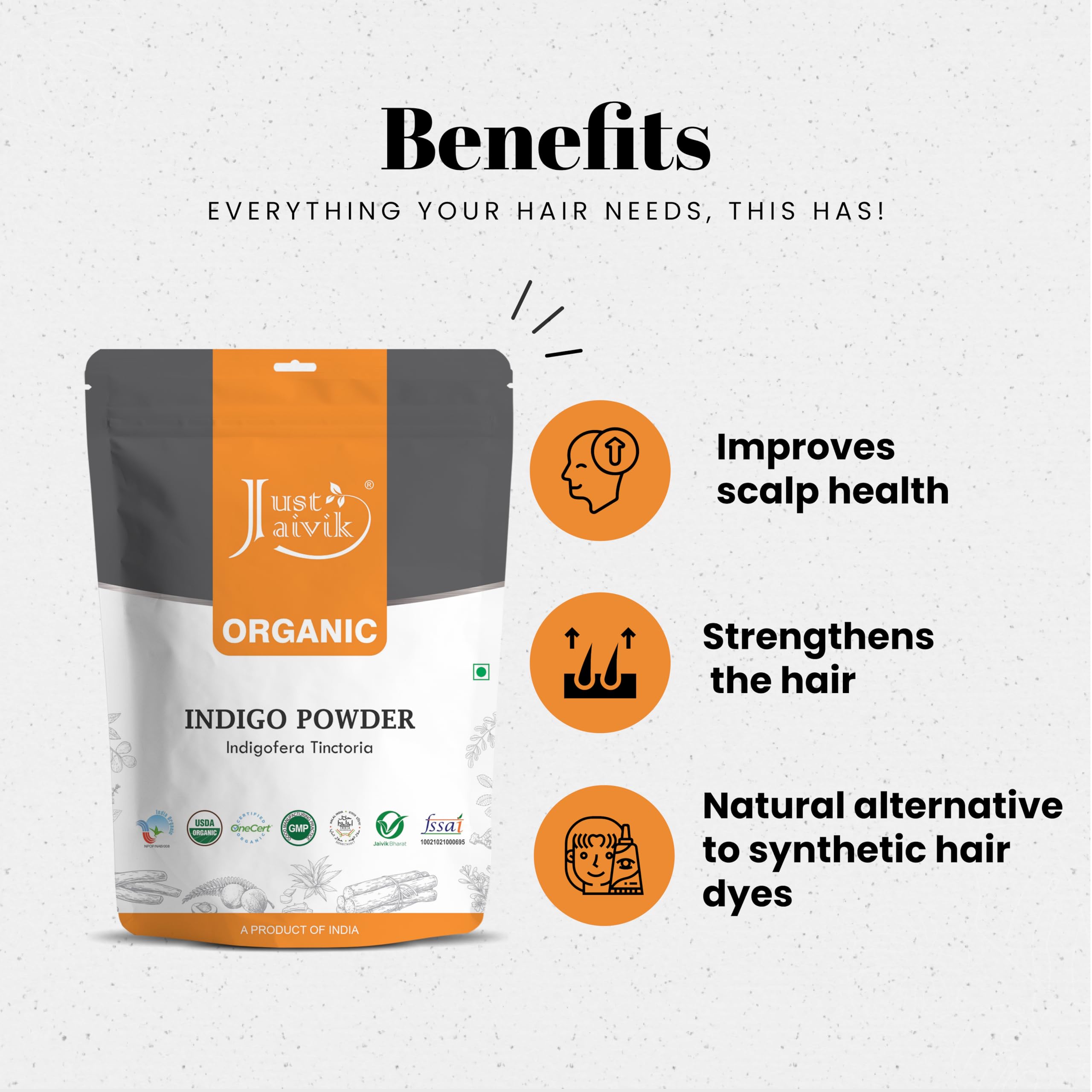 Just Jaivik 100% Organic Indigo Powder - 227 gms / 1/2 LB Pound / 08 Oz - Indigofera Tinctoria- A 100% Organic Hair Dye - Color your hair dark brown to black with Henna
