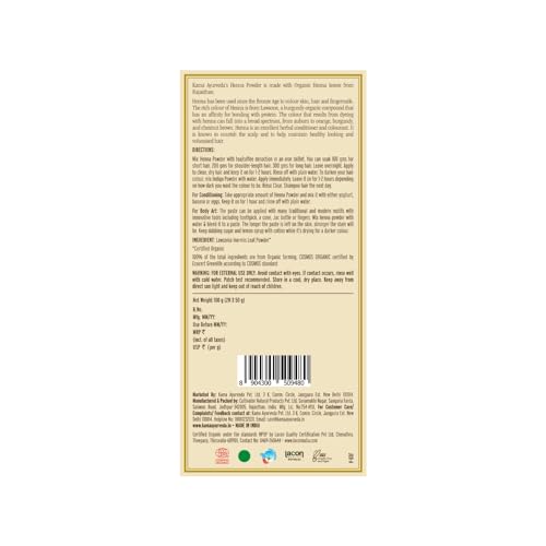 Product Description- Kama Ayurveda 100 percent Organic Henna is made with Organic Henna leaves from Rajasthan . It is Certified Organic by Ecocert India Pvt Ltd. Henna has been used since the Bronze Age to coloue skin hair and fingernails . Henna;s colouring properties are due to Lawson a burgundy organic compound that has an affinity for bonding with protein . The colour that results from dying with henna can fall into a broad spectrum from auburn to orange burgundy chestnut brown . HENNA FOR HAIR: Henna is an excellent herbal conditioner and colorant. It nourishes the hair making it shiny soft and silky. Henna repairs and seals the cuticle thus helps in healing hair shaft preventing hair breakage. Henna balances the pH of the scalp thus preventing premature hair fall graying and dandruff. It also reverses the effects of pollution on hair as well as dryness due to excessive blow drying dyeing etc. Henna also has anti-fungal and preservative properties. HAIR CONDITIONONG: Mix henna with curd or water to make a paste and apply it all over the head wearing hand gloves. Rinse the mixture off your hair after an hour or so . You might have to wash your hair a couple of times before you get rid of all the henna from your hair . Oil hair post wash for better gloss and shine . HAIR DYING:To colour your hair dark mix the henna powder lemon juice coffee and water in an iron skillet to make a paste and let it stay overnight. However if you wish to colour vibrant reddish brown do not use skillet or any iron utensil . Apply it all over the head wearing hand gloves . Rinse the mixture off your hair after an hour or so. Henna for Bodyart (Temporary tatoos): The paste can be applied with many traditional and modern motifs with innovative tools including toothpick a cone Jac bottle or fingers. For Men & WomenFrom the Manufacturer Organic Henna Powder100% OrganicKama Ayurveda 100% Organic Henna is made with Organic Henna leaves from Rajasthan. It is Certified Organic by Ecocert India Pvt Ltd. Henna has been used since the Bronze Age to coloue skin hair and fingernails. Henna;s colouring properties are due to Lawson a burgundy organic compound that has an affinity for bonding with protein. The colour that results from dying with henna can fall into a broad spectrum from auburn to orange burgundy chestnut brown. Henna for HairHenna is an excellent herbal conditioner and colorant. It nourishes the hair making it shiny soft and silky. Henna repairs and seals the cuticle thus helps in healing hair shaft preventing hair breakage. Henna balances the pH of the scalp thus preventing premature hair fall graying and dandruff. It also reverses the effects of pollution on hair as well as dryness due to excessive blow drying dyeing etc. Henna also has anti-fungal and preservative properties. Hair ConditioningMix henna with curd or water to make a paste and apply it all over the head wearing hand gloves. Rinse the mixture off your hair after an hour or so. You might have to wash your hair a couple of times before you get rid of all the henna from your hair. Oil hair post wash for better gloss & shine. Hair DyingTo colour your hair dark mix the henna powder lemon juice coffee and water in an iron skillet to make a paste and let it stay overnight. However if you wish to colour vibrant reddish brown do not use skillet or any iron utensil. Apply it all over the head wearing hand gloves. Rinse the mixture off your hair after an hour or so. Henna for Bodyart (Temporary Tattoos)The paste can be applied with many traditional and modern motifs with innovative tools including toothpick a cone Jac bottle or fingers. How to UseMake henna paste using plain water (add coffee/tea for natural tinge) apply on hair. Leave it on for 30 mins (as a conditioner) 45 mins (for colour). Rinse with normal water. Ingredients Lawsonia InermisIt is also known as Henna. It is a good conditioner for hair work on damaged hair. It has good cooling properties and add strength & thickness to hair.
