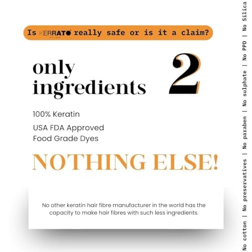 • 100% KERATIN. Kerrato hair fibres are made using 100% keratin and are suitable for people with thinning hair alopecia male pattern baldness female pattern baldness hair.