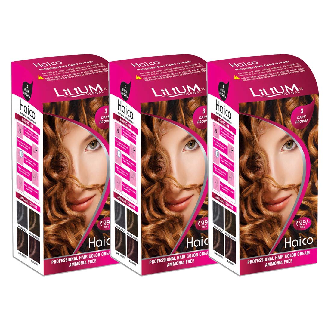 Lilium Herbal Haico Professional Dark Brown Hair Color Cream Ammonia Free Pack of 3