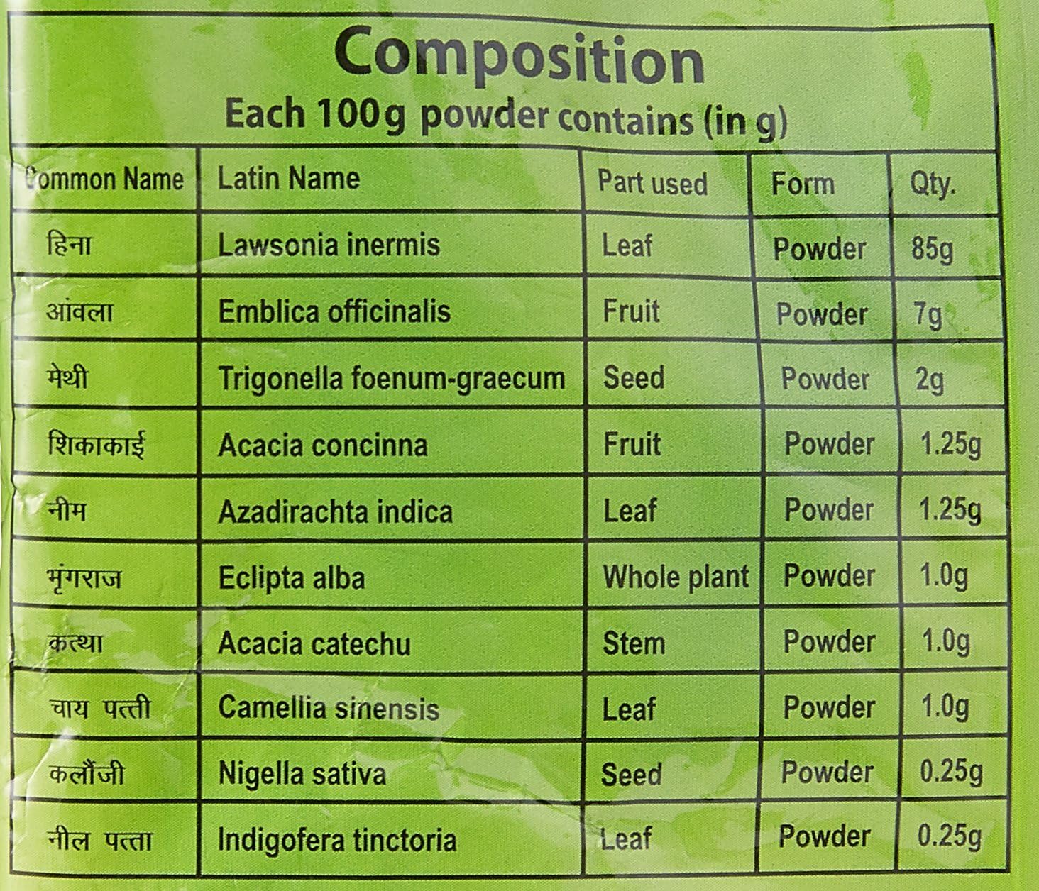 Patanjali Herbal Mehandi (Henna) is made from goodness of 10 herbs. It naturally conditions and colours the hair. It improves hair growth, reduces hair fall and provides cooling to scalp. Synergetic effect of herbs (Henna, Amla, Fenugreek, Shikakai, Neem, Bhringraj, Katha, Tea, Black Cumin, True indigo) naturally colour, strengthen and conditioned the hair.