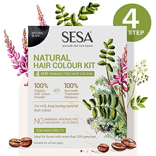 SESA 4 Step Natural Hair Colour Kit - For HIGH GREY% - 100% Organic & Ayurvedic - NO Ammonia, PPD, Peroxide, 200gm + 40ml