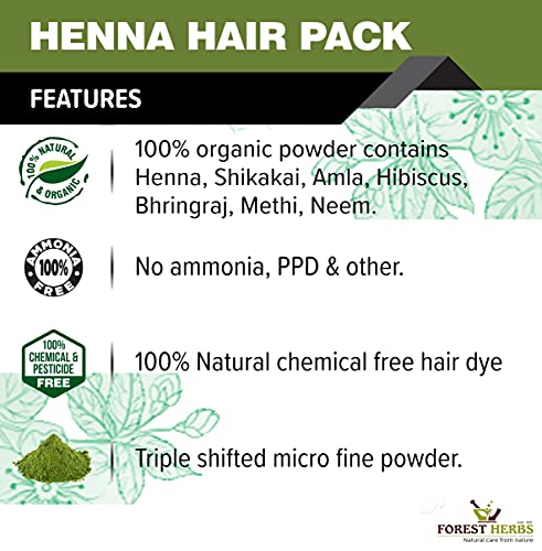 • Made of freshly cultivated Henna leaves The Chemical free Organic & 100% pure Forest Herbs Mehndi gives natural rich reddish tone to the hair and thus the best PPD-free substitute to hair dyes.