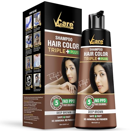 VCare Hair Colour Shampoo for Men and Women, 180ml, Deep Brown | No Ammonia | Long Lasting Hair Color | 100% Grey Coverage | Easy To Use Hair Colour At Home