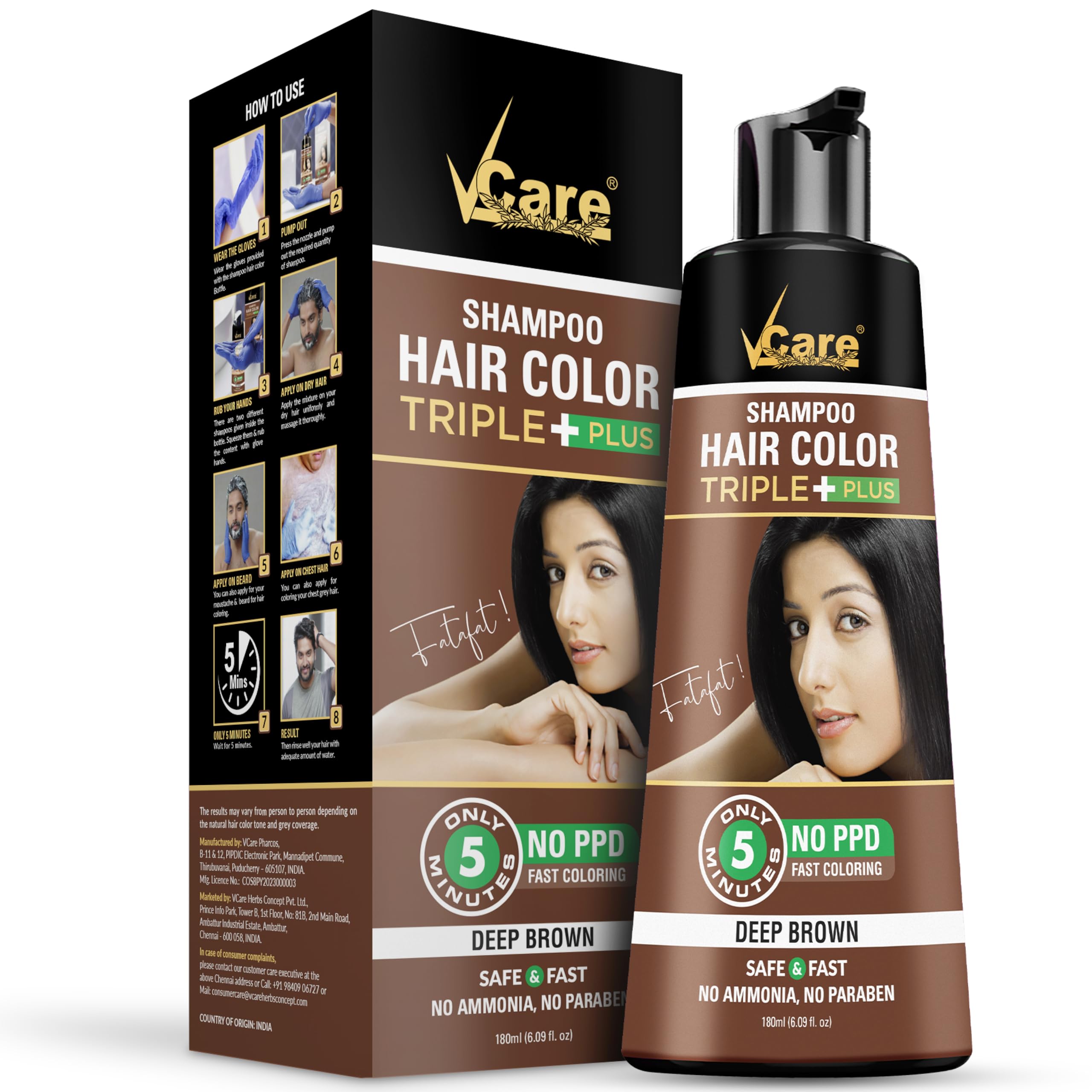 VCare Shampoo Hair Colour Shampoo Dark Brown 180ml for Women and Men | Only 5 Minute Root Hair Dye Coloring Kit | No Parabens Ammonia And Sulfates | Salon like Hair Color at Home