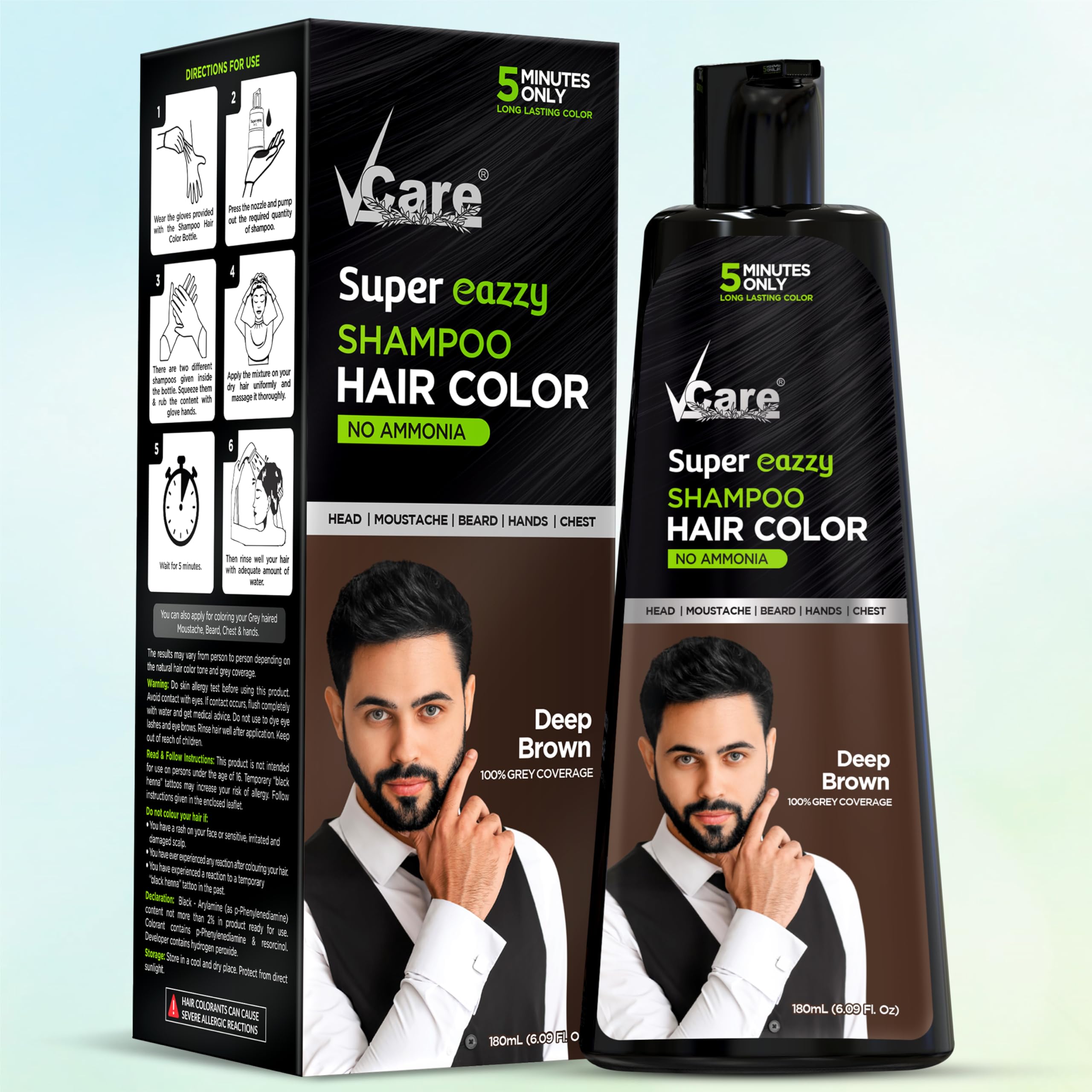 VCare Super Eazzy Hair Colour Shampoo can be applied with bare wet hands. It is a combination of Shampoo Color & Conditioner and is purely natural & enhanced with pearl extract. One time application gives amazing results in just 15 minutes. VCare Super Eazzy Hair Colour Shampoo has been recognized by the industry for its pleasant fragrance and ease of use.It is the best Personal Hair Colour Shampoo for both men and women Vcare shampoo Hair Colour is safe to use and actually takes care of your hair. Vcare shampoo Hair Color Control hair damage and makes them look softstrong and shiny. Plant keratin replenishes and strengthens hair repairing its natural structure. It keeps the hair smooth and frizz-free. Hair is left stronger and thicker.