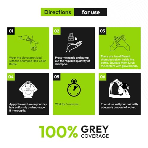 • 20 MLQUICK AND EASY TO USE: Use the gloves that we have provided. Apply the shampoo to the hair and massage gently for 5 – 10 minutes. Rinse the hair and you will get black hair