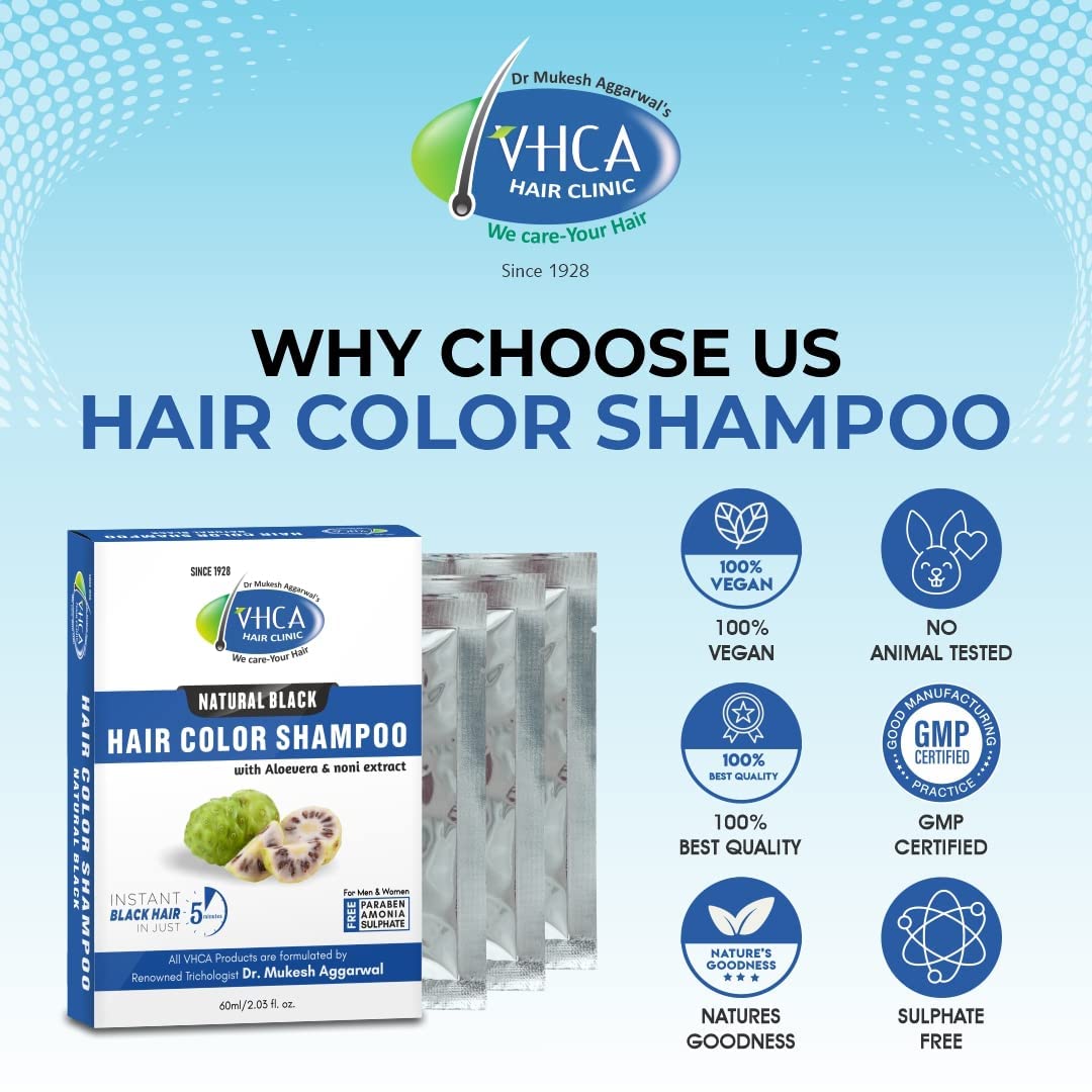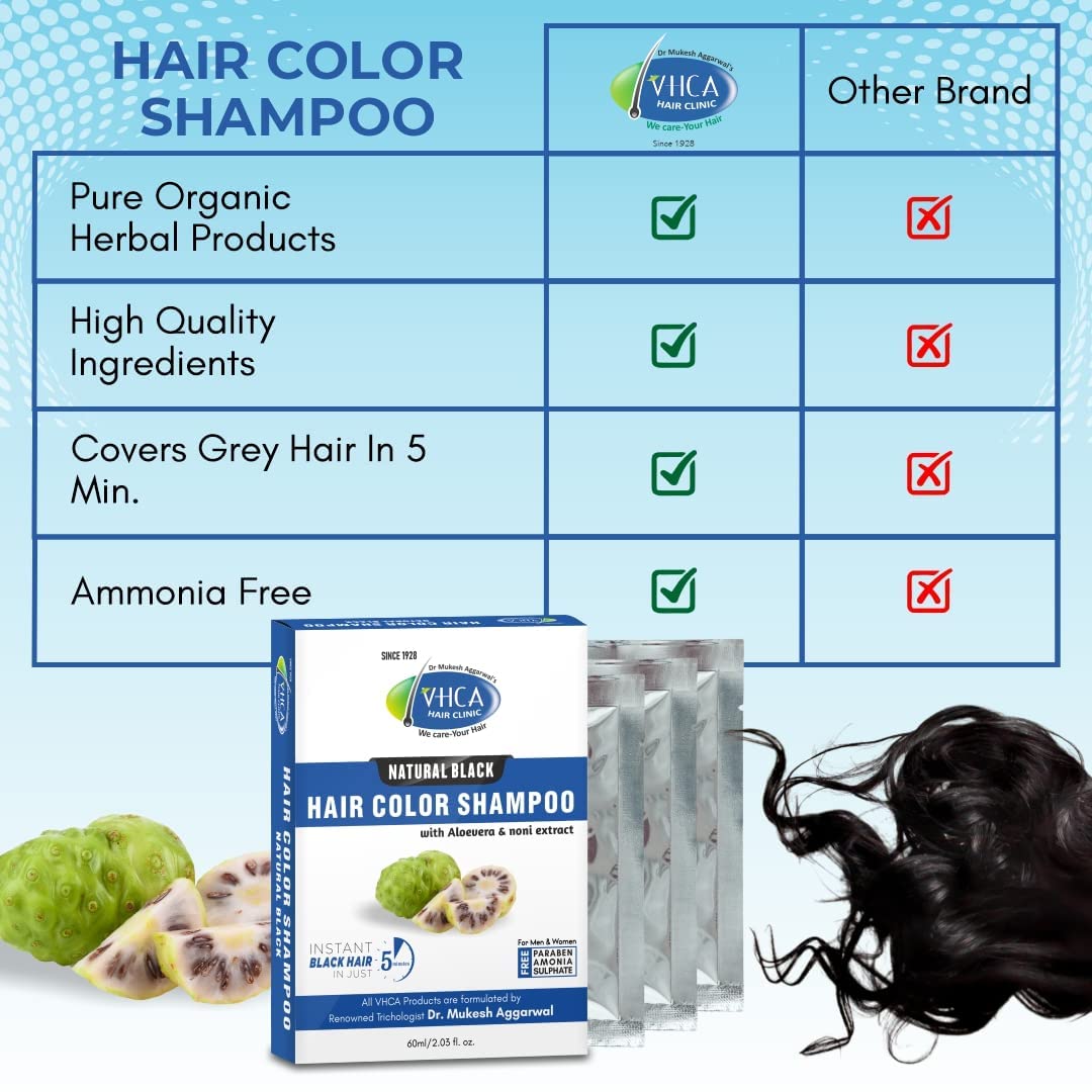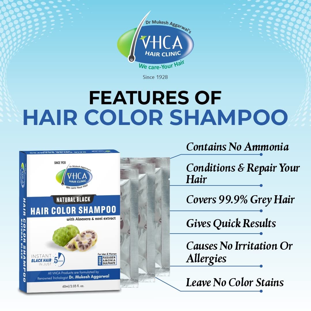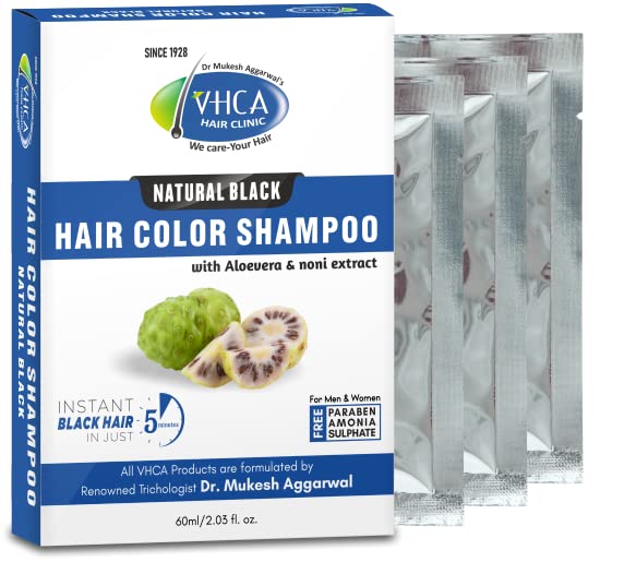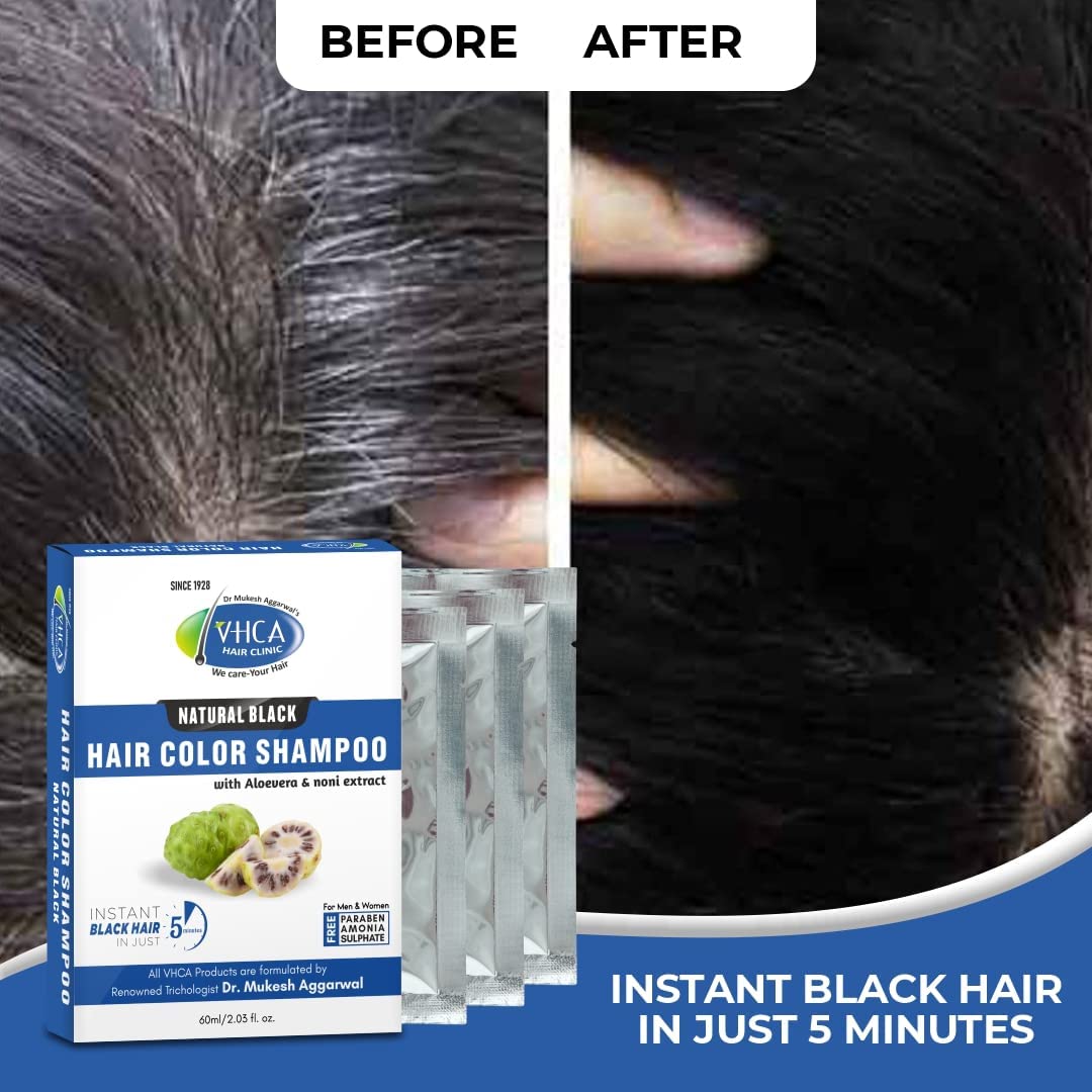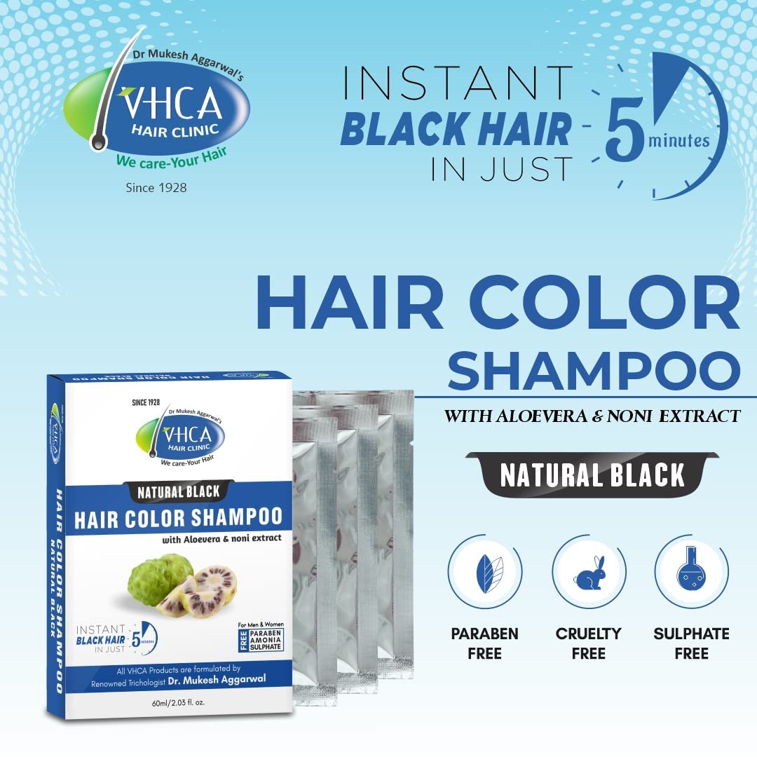 VHCA Black Beard color shampoo is with noni extract. This Beard Hair Color Shampoo is free from harmful chemiclike paraben and sulfate. This beard Color Shampoo Black Natural contains ayurvedic ingredients. This Beard Hair Color Shampoo can be used on hair and the good thing about this product it is free from harmful chemiclike paraben and sulfate. VHCA Beard Color Shampoo contains Noni Extract Aloe Extract Olive Oil Ginseng Extract and Aqua. A Pack of 75 ml is provided in 5 Sachet each contain 15 ml for one time use. How to use: Pump Adequate Shampoo Hair Color on Hands. Massage it thoroughly on hair. Rinse Hair After 5-10 minutes.