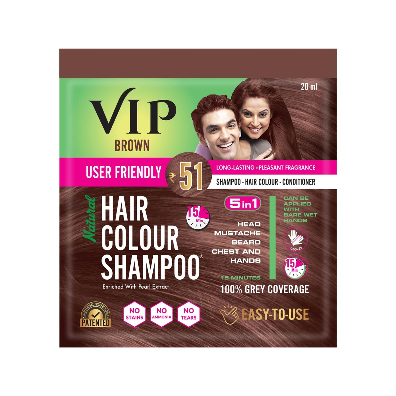VIP Hair Colour Shampoo Brown 20ml | Ammonia-Free Hair Color for Men and Women | Pack of 12
