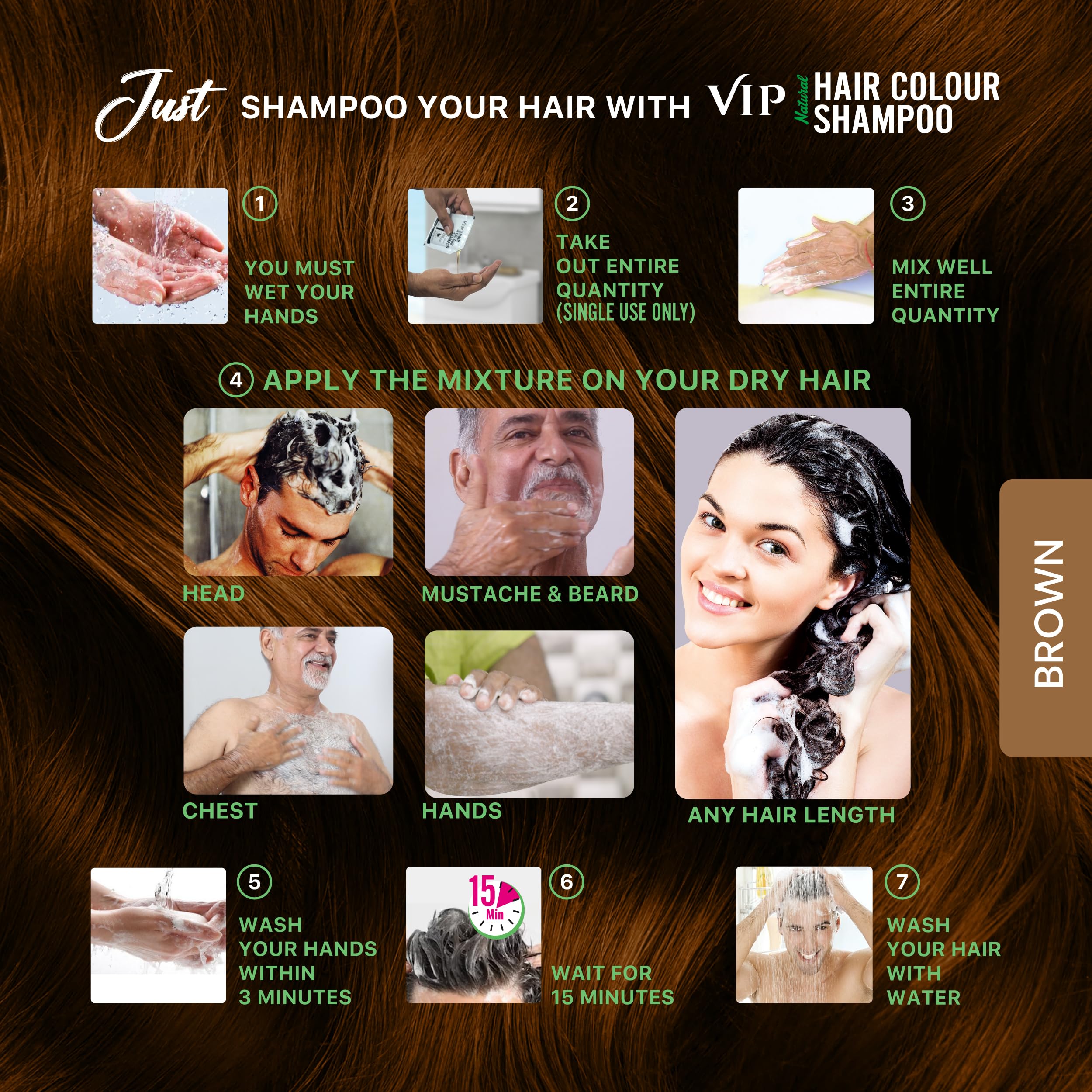 Instant Hair Transformation: To get gorgeous brown hair color quickly use our VIP Hair Colour Shampoo. Apply now and watch the magic happendon't wait any longer.