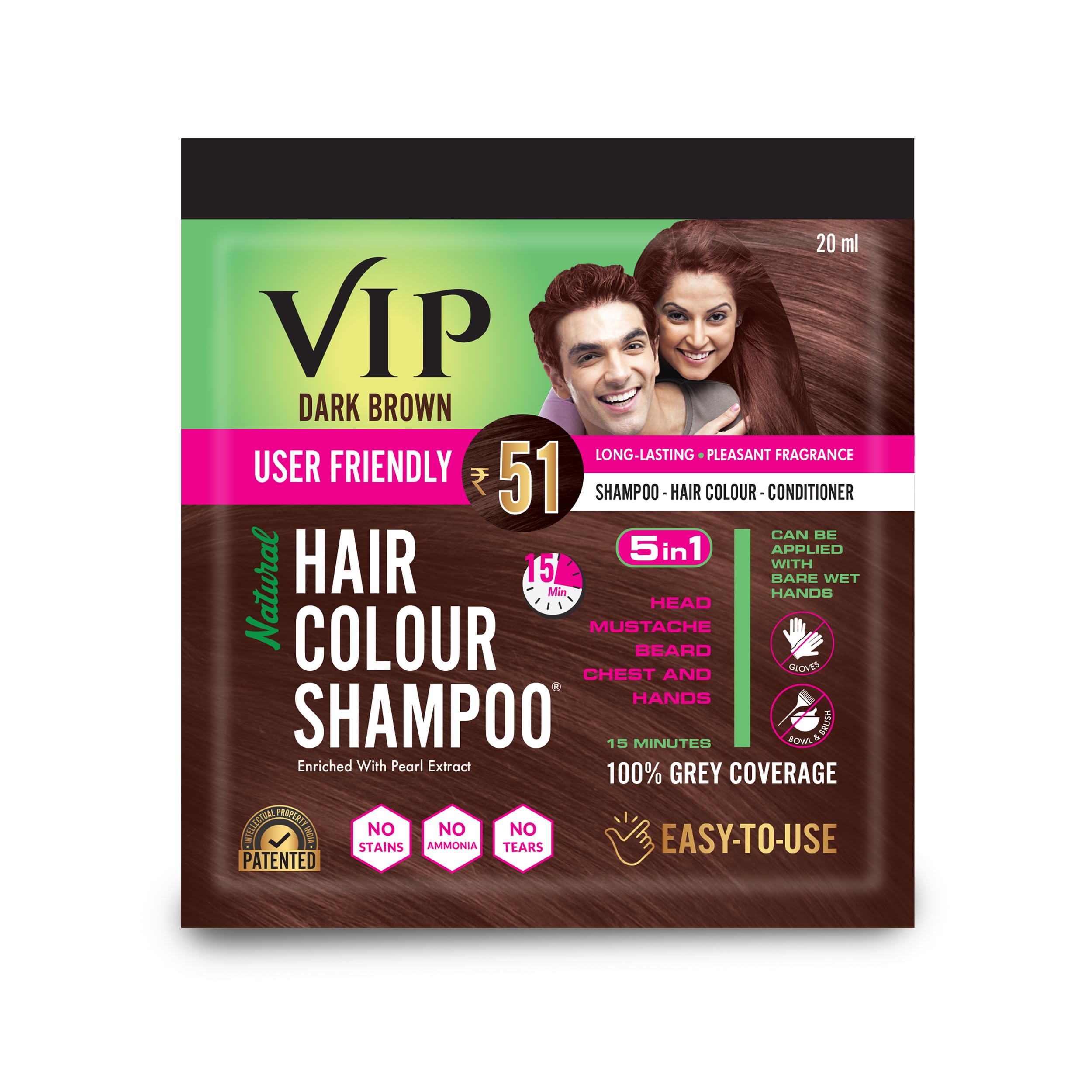 VIP Hair Colour Shampoo dark brown | grey hair coverage in 15 minutes 20ml (pack of 5)