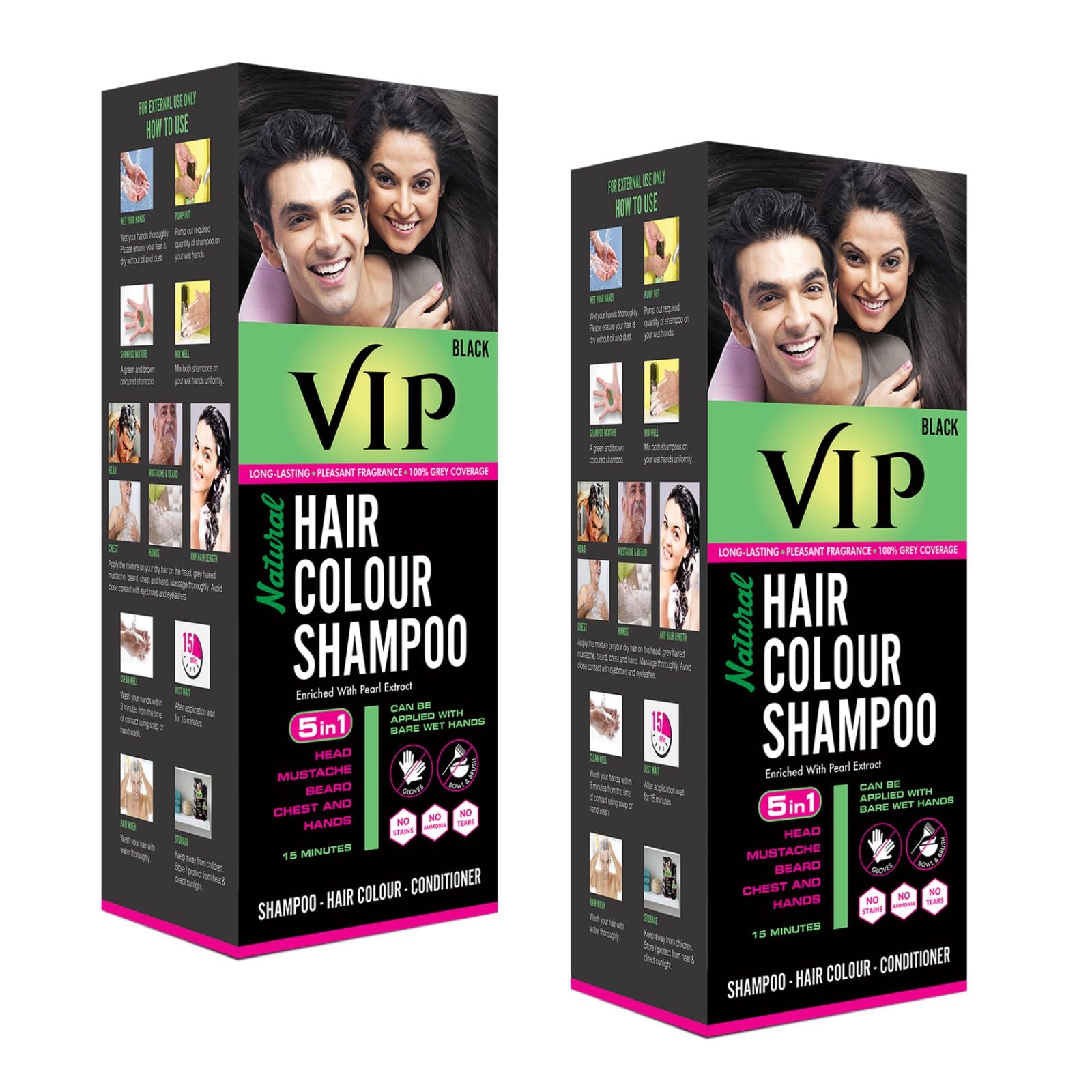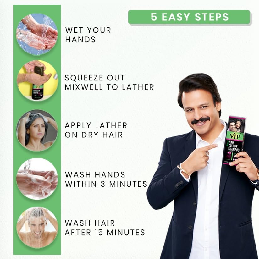 VIP Hair Colour Shampoo can be applied with bare wet hands. It is a combination of Shampoo Hair Color & Conditioner and is purely natural & enhanced with pearl extract. One time application gives amazing results in just 15 minutes. It does not require the use of gloves. VIP Hair Colour Shampoo is one of the bestselling hair colour shampoos and has been recognized by the industry for its pleasant fragrance and ease of use. Each application lasts for 3-4 weeks (based on number of washes). However a re-touch is recommended every 2-3 weeks to keep your looks Young & Trendy. Key Features Easy application for Hair Beard Chest & Moustache No need to use Gloves no staining on Skin or Hands No ammonia Natural ingredients Natural colour in just 3-minutes Get DONE in 15 minutes for any length hair Directions for Use Ensure your hair is completely dry without oil & dust. Wet your hands thoroughly. Take generous amount of shampoo on your wet hands and mix it well. Let it lather. Apply the lather on your hair uniformly and massage the head thoroughly. Wash your hands within 3 minutes from the time of contact using soap or hand wash. Wait for 15 minutes. Then rinse your hair with adequate water. Preliminary test should be done to identify whether your skin is prone to any sensitivity.