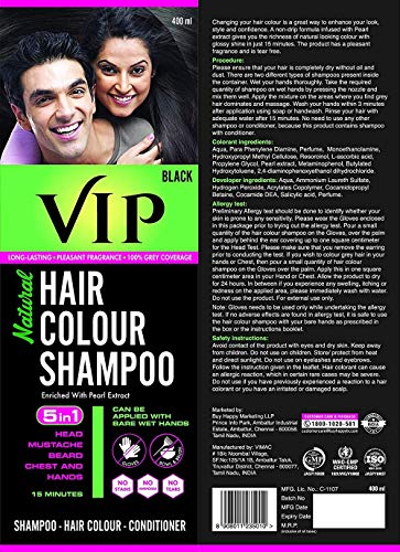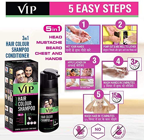 3 in 1 : VIP Hair Colour Shampoo comes as a 3 in 1 Hair Color Conditioner and Shampoo. It gives pleasant fragrance and enriched with pearl extract and gives a shiny natural hair color. One-time application gives instant results in just 15 minutes. SHAMPOO BASED HAIR COLOUR : This 400ml Unisex Shampoo based hair colour is loved by both Men & Women. It is a perfect family pack hair color shampoo and gives 5 In 1 Coverage for men. Colour your Hair Moustache Beard Chest Hair and Hand Hair! Women prefer the VIP Hair Colour Shampoo over any other creme color / gel color hair dye or Shampoo. Women love the secret salon hair colour looks which they get at the comfort of their home.
