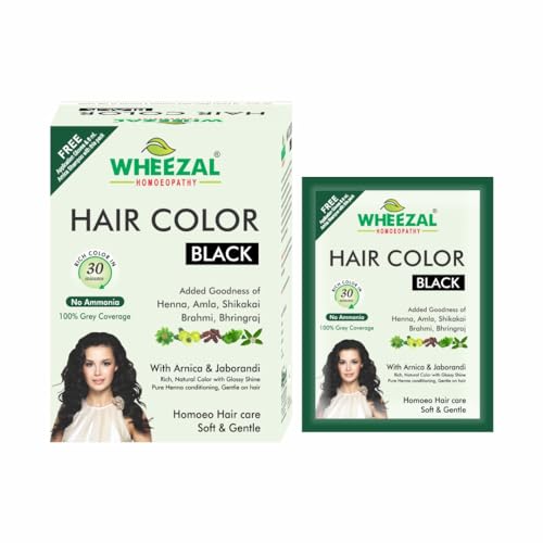 Added Goodness of Henna Amla Shikakai Brahmi Bhringraj With Arnica & Jaborandi Rich Natural Color with Glossy Shine Pure Henna conditioning Gentle on hair. Homoeo Hair care Soft & Gentle RICH COLOR IN 30 MINUTES No Ammonia - 100% Grey Coverage From time immemorial Henna has been regarded as one of the most beneficial herbs. It is one of the best herbal conditioners for hair. Henna is used to color hair and makes hair shine and helps to keep it nourished at all times. Wheezal's Hair Color is a unique blend of Henna and other essential herbs such as Amla Shikakai Brahmi and Bhringraj to color grey hair with the goodness of nature. Jaborandi and Arnica control dandruff premature greying & falling of hair. This hair color can be used for all hair types and provides nourishment to the hair making them lustrous shiny soft & manageable. INGREDIENTS : Henna Powder Barium Peroxide Para Phenylene Diamine Citric Acid Arnica Powder Amla Powder Bhringraj Shikakai Powder Jaborandi Powder Sodium Sulphite. CAUTION : This product contains ingredients which may cause skin irritation in certain cases and so a preliminary test according to the accompanying directions should first be made. This product should not be used for dyeing the eyelashes or eyebrows as such a use may cause blindness. SENSITIVITY TEST : This preparation may cause inflammation of the skin in some cases and so a preliminary test should be carried out to determine whether or not special sensitivity exists. For carrying out the test cleanse a small area of the skin behind the ear or upon the inner surface of the forearm using soap and water. Prepare a small quantity of paste and apply it to dry. After 24 hrs wash the area gently with soap and water. If no irritation or inflammation is apparent it may be assumed that no hypersensitivity due to the dye exists. This test should however be conducted before each and every application of use.