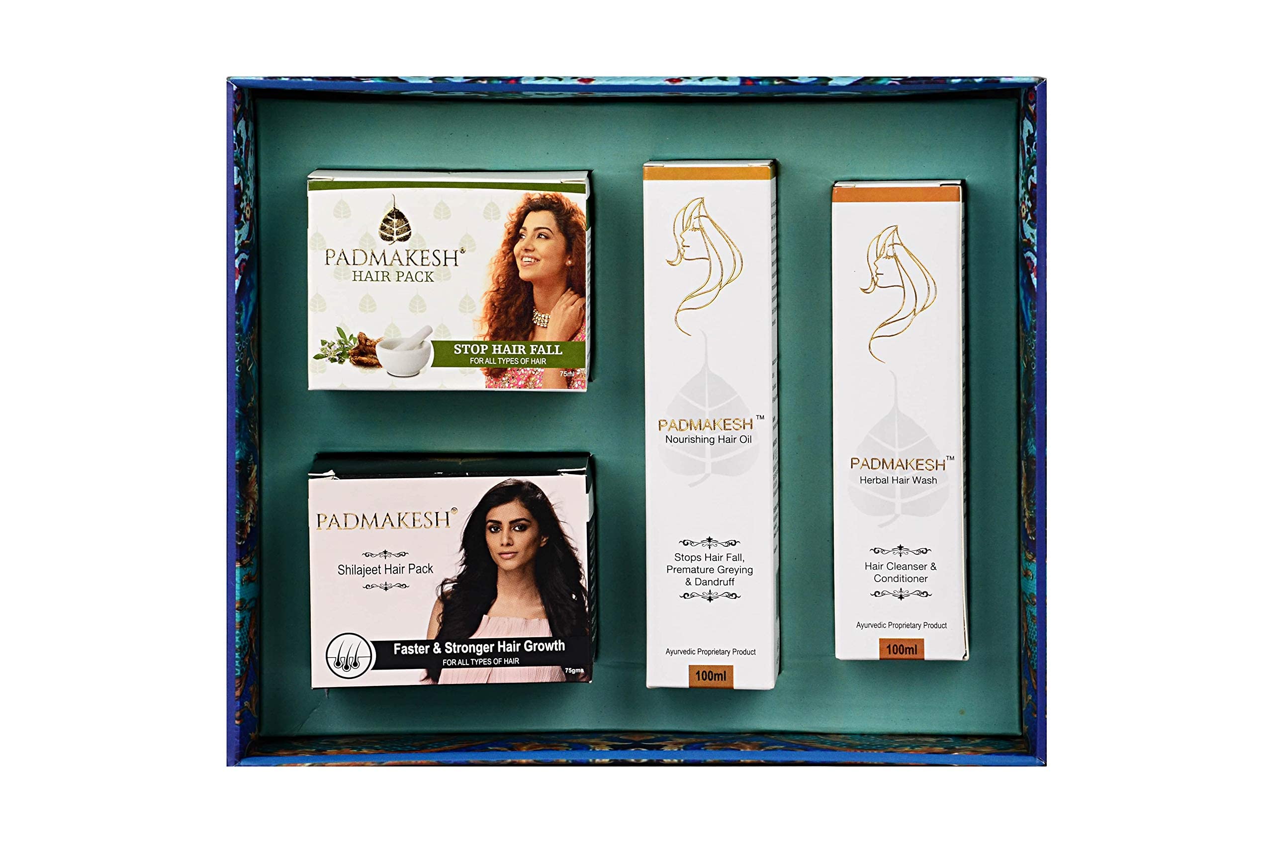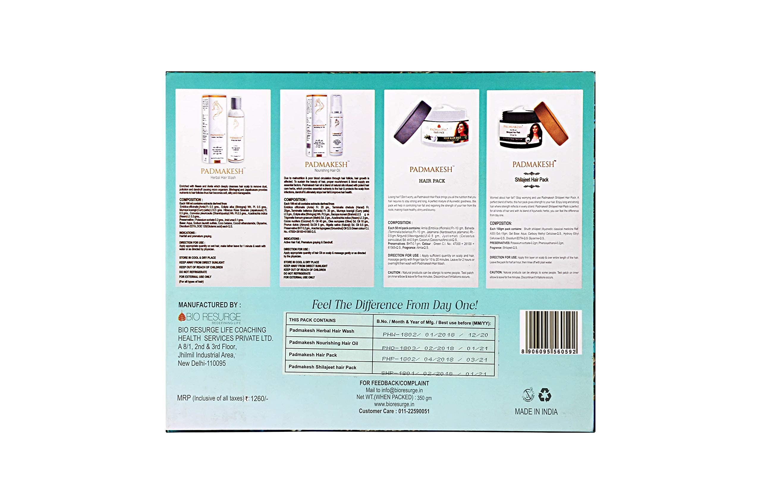 Padmakesh's hair spa kit is everything you will need to Help hair fall remove dandruff battle premature greying and an itchy scalp. This kit consists of our herbal hair cleanser nourishing hair oil Padmakesh Help hair fall pack and Padmakesh shilajit hair pack. This makes for a great gift.Benefits: Contains shudh shilajit (asphaltum) which is an invaluable nutrient dense mineral containing 28 micronutrients and vitaminsMost efficient and effective solution to stop hair fall completelyEnriched with Neem and Amla which deeply cleanses the hair and scalp and dandruff causing micro organismVery gentle and mild on the scalp Suitable for all hair typesNatural ingredients No artificial color or fragrance addedBhringraj amla baheda jatamansi nirguni coconut oil and Japakusum provide nutrients to hair follicles making hair stronger softer and shinierFor best results use with Bio Resurge's padmakesh herbal hair spa kitWhy This Product:It's Helps to Regaining the strength of your hair from the roots making it look healthy shiny and bouncy