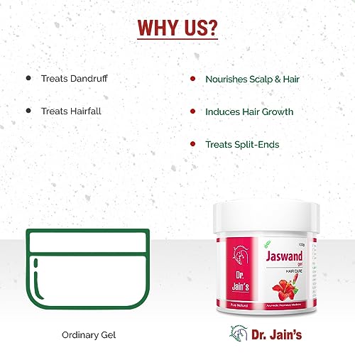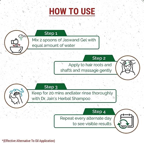"Mix 2 spoons of Jaswand Gel with an equal amount of water. Apply to hair roots and shafts and massage gently. Keep for 20 mins and later rinse thoroughly with Dr. Jain's Herbal Shampoo. Repeat every alternate day to see visible results. BENEFITS FOR HAIR - Reduce Burning Reduce Scalp Itching Maintain Scalp Health Cools The Scalp Maintain Natural Hair Colour Treats Dandruff Prevents Greying Of Hair Stops Hairfall Boosts Hair Growth" Description:- Dr. Jain's Herbal Products is one of the well-recognized manufacturers of Herbal Health Skin & Hair Care Ayurvedic Powders Gels & Aromatic Essential Oils. As per the demands a well-researched formulation based on pure herbal and superior quality Ayurvedic products. Jaswand Gel is a 100% Natural Gel combined with Pure Hibiscus & Other Herbs to increase hair growth and maintain natural hair color providing excellent nutrition and removing excessive heat.