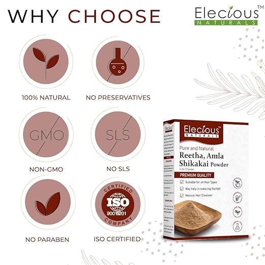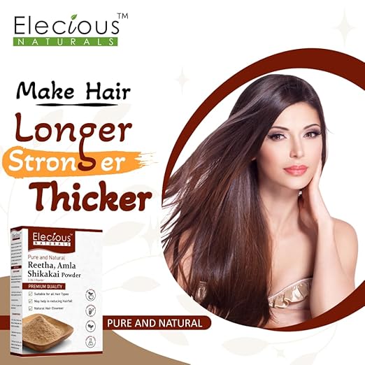 100% NATURAL: Elecious Reetha, Amla, and Shikakai powder is 100% pure powder prepared from high quality, Handpicked, Reetha nut shells, Shikakai, and seedless Amla which are shade-dried and processed naturally.