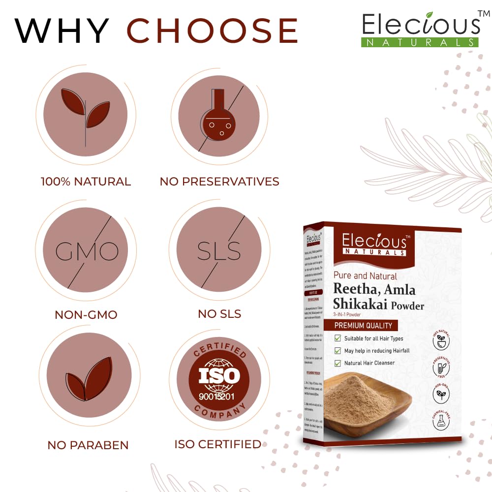 Elecious Pure Amla Reetha Shikakai Powder for Hair | Natural Hair Cleanser | 100% Natural No Chemical or Preservative | SLS Paraben-Free | Prevents Hairfall & Dandruff Boost Hair growth