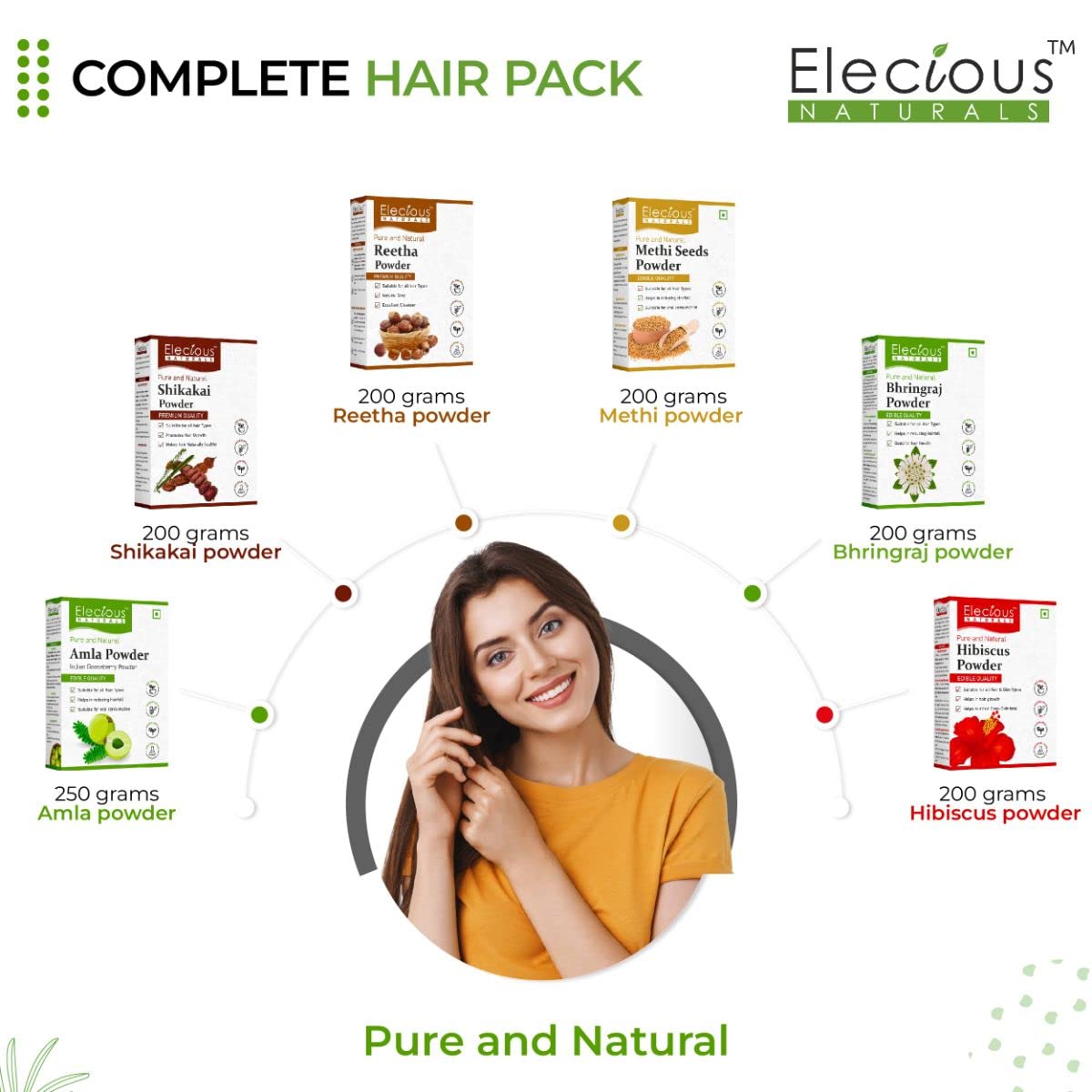 Elecious Naturals Complete Hair care combo Kit - Contain 6 powders (Amla Powder Reetha Powder Shikakai Powder Methi Powder Bhringraj Powder and Hibiscus powder) | 100% Natural and Preservative Free | Make hair strong shiny and silky | Reduce Hairfall and