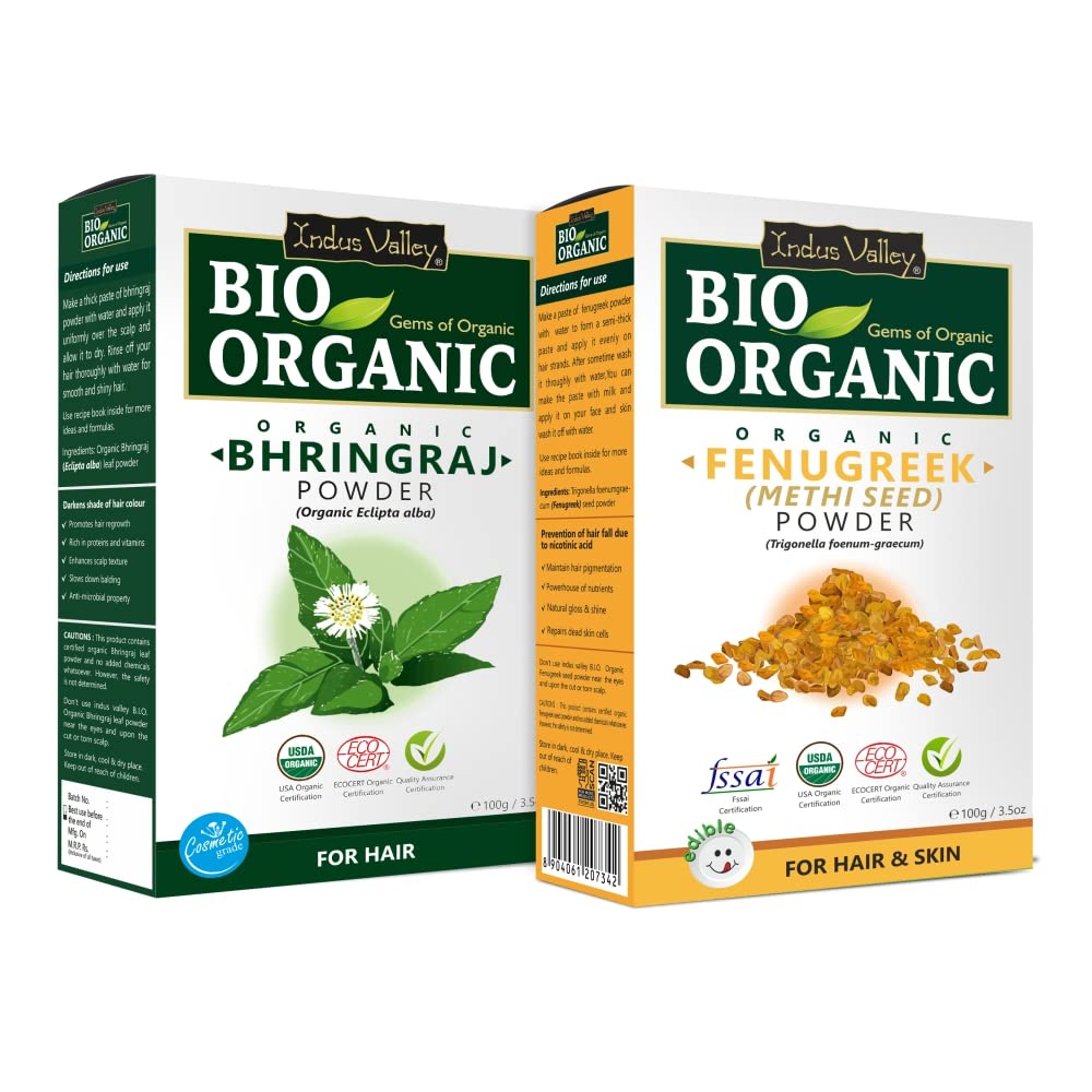 Indus valley 100% chemical free powder without any added chemicals fillers and preservatives. Bhringraj Powder is 100% natural powder cultivated from the fresh crops. Bhringraj powder for hair growth has regenerative properties that help repair hair follicles as well as strengthen the scalp tissue to encourage healthy hair growth. Bhringraj powder 100 gm pack also supports scalp circulation which in turn nourishes hair follicles and reduces hair loss reduces dandruff and itchiness from scalp. Repairs dry and damaged hair and add intense sheen to hair.Fenugreek extract powder works within the digestive system to eliminate all the toxins from the body. It controls the excess oil that skin releases and further stops from causing acne pimples. Fenugreek powder organic provides elasticity to the skin which helps in age reversal. It can also render beautiful skin by exfoliating the dead skin. It is recommended to use this pack twice a week for best results.
