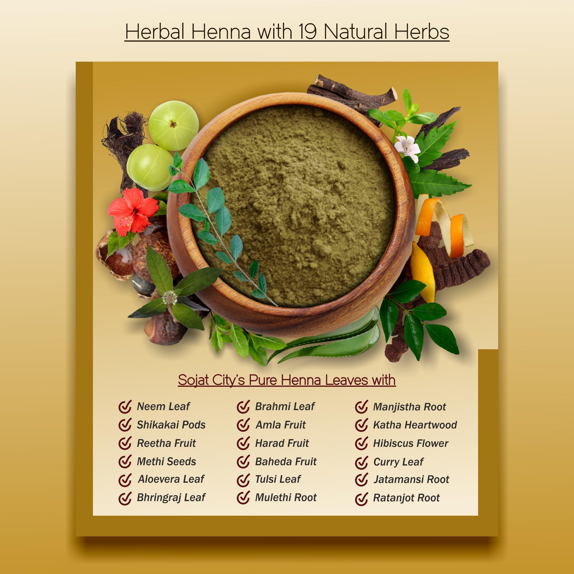 • Herbal Mehndi for Hair Nourishment: It is an ancient and traditional blend of 19 potent natural herbs like Amla Reetha Shikakai Bhringraj Hibiscus Brahmi Methi Tulsi Neem Aloevera Mulethi Triphala Manjistha Jatamansi Katha etc. mixed in unique proportions