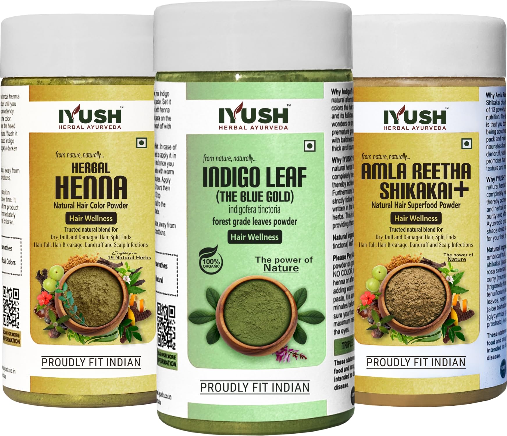 IYUSH Herbal Ayurveda Amla Shikakai Reetha Powder for Hair with 13 Herbs plus Indigo Powder and Herbal Henna Powder for Hair Colour 300gm | Herbal Hair Wash Powder | Hair Volume Powder | 100gm each