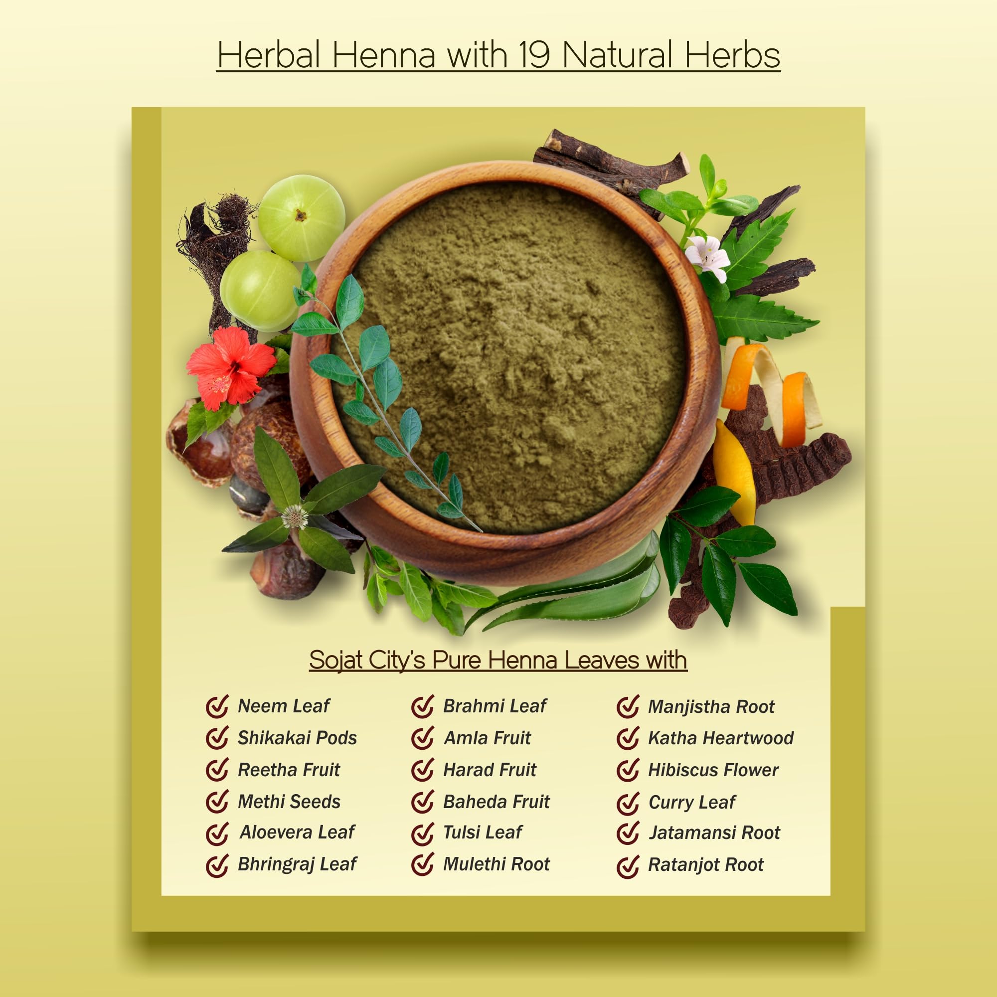 • Herbal Mehndi for Hair Nourishment: Herbal Henna powder is an ancient and traditional blend of 19 potent natural herbs like Amla Reetha Shikakai Bhringraj Hibiscus Brahmi Methi Tulsi Neem Aloevera Mulethi Triphala Manjistha Jatamansi Katha etc. mixed in u