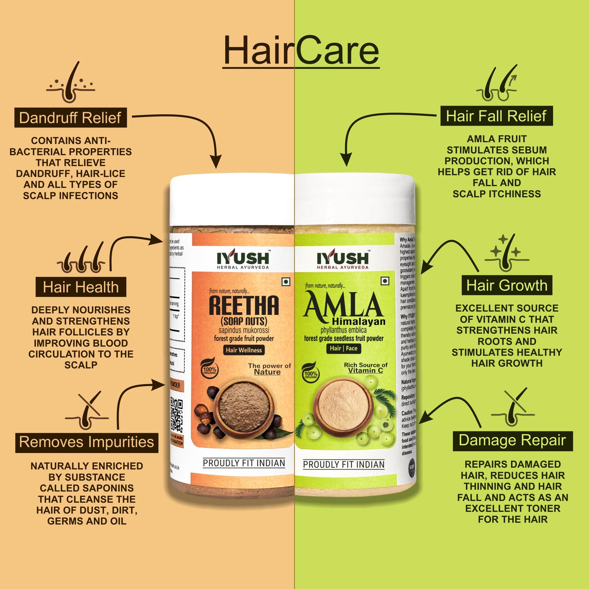 IYUSH Herbal Ayurveda Reetha Powder and Amla Powder for Hair Growth Organic 200gm | Hair Mask for Dry and Frizzy Hair | Hair Volume Powder | Herbal Hair Wash Powder | Hair Powder | 100gm each