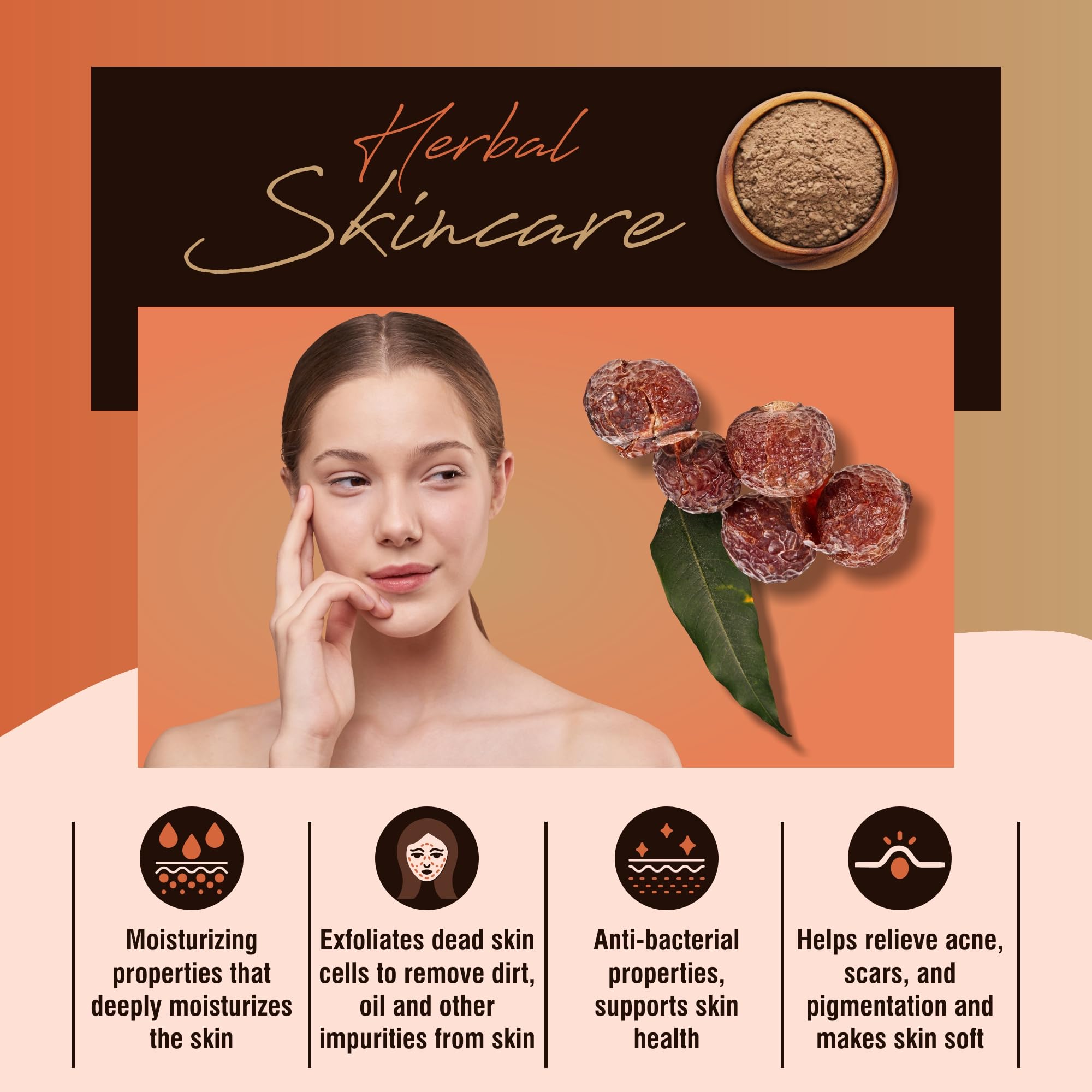 • Good for Skin: Deeply exfoliates dead skin cells to remove dirt oil and other impurities from the skin. Loaded with anti-inflammatory and anti-bacterial properties that support skin health and relieve acne scars and pigmentation. Apart from this Reetha po