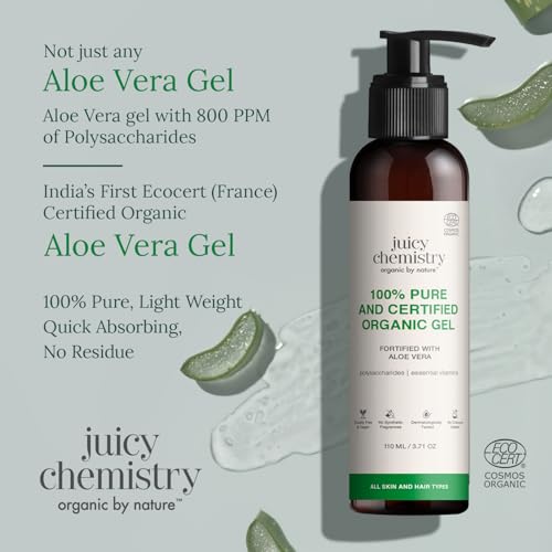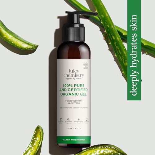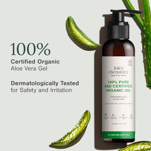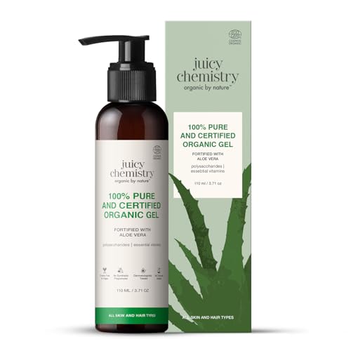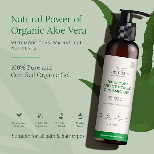 HomeHealth & PersonalHair CareHair MasksJuicy Chemistry Organic Aloe Vera Gel, 110 ml Multipurpose Gel | 100% Pure Aloe Vera Gel for Face, Hair & Body | Fresh and Soothing | Free from Parabens, Sulphates, Mineral Oils | For Men & Women