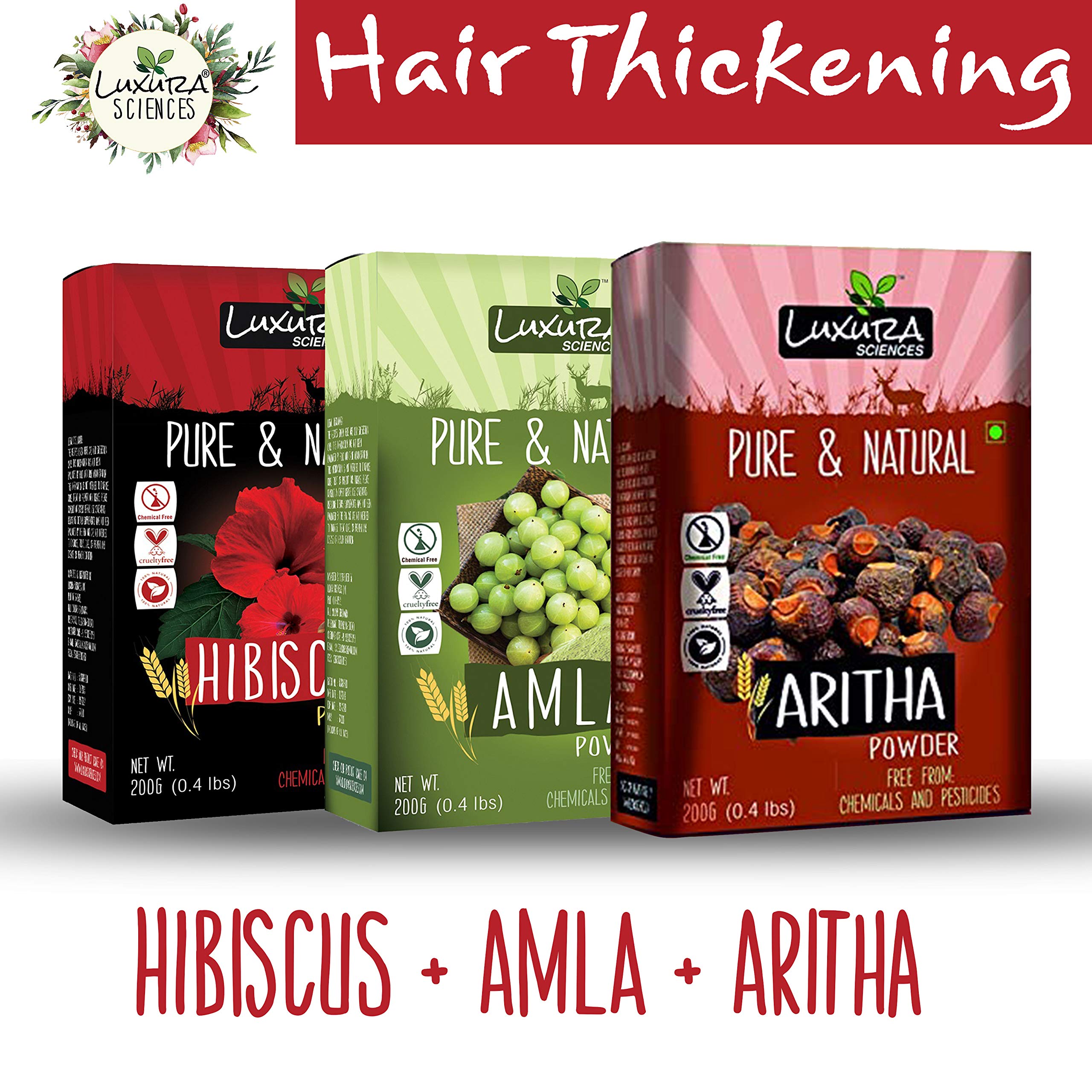 Luxura Sciences Natural Hair Care Set (200g each) Hibiscus Amla & Aritha Powders. Nourish & strengthen your hair with this natural chemical-free hair care combo.